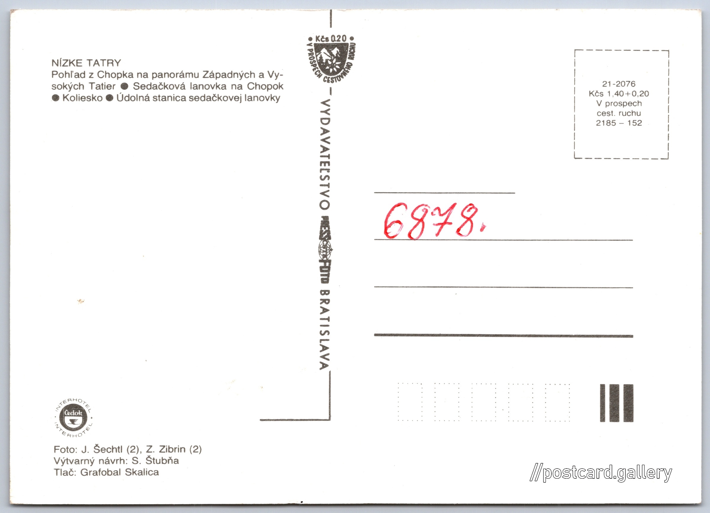 Nízké Tatry Pokud chcete vidět pohlednice ve vyšším rozlišení nebo zobrazovat jejich zadní stranu, tak se prosím nejdříve přihlašte Přihlásit Zaregistrovat Interhotel RužomberokČedok NÍZKE TATRY- Pohľad z Chopka na panorámu Západných a Vysokých Tatier- Sedačková lanovka na Chopok- Koliesko- Údolná stanica sedačkovej lanovky Jazyk tištěného textu na pohlednici: slovenština Demänovská Dolina ukázat na mapě Vydavatel: PressFoto Bratislava (Československo) Rok vydání pohlednice: 1985 Velikost (š x v) a tvar pohlednice: 147 x 105 mm (5.79" x 4.13"), obdélník Osoby spjaté s touto pohlednicí: S. Štubňa(Design pohlednice) Z. Zibrin(Autor fotografie) Josef Šechtl(Autor fotografie) Čistá pohlednice (neprošlá poštou) Ceny: Cena pohlednice: 1,40 Kčs (CSK) (+0,20 Kčs přípl. na tur. ruch) Kódy na pohlednici: 21-2076 2185-152 DiskuseVložit příspěvek Přidat novou složku ... Spravovat složky ...
