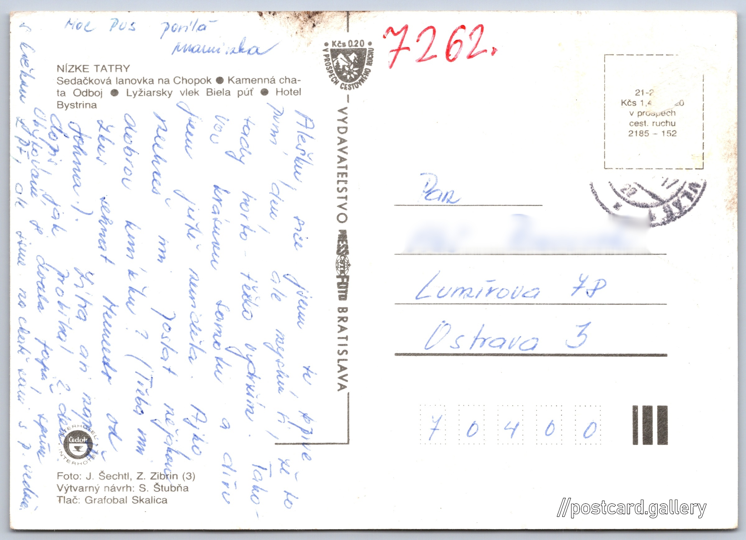 Nízke Tatry Pokud chcete vidět pohlednice ve vyšším rozlišení nebo zobrazovat jejich zadní stranu, tak se prosím nejdříve přihlašte Přihlásit Zaregistrovat Interhotel RužomberokČedok NÍZKE TATRY- Sedačková lanovka na Chopok- Kamenná chata Odboj- Lyžiarsky vlek Biela púť- Hotel Bystrina Jazyk tištěného textu na pohlednici: slovenština Demänovská Dolina ukázat na mapě Přesné místo není známo. Pokud jej znáte, tak jej prosím napište do komentářů nebo označte na mapě Vydavatel: PressFoto Bratislava (Československo) Datum vydání není známo Pomozte nám odhadnout datum vzniku pohlednice Velikost (š x v) a tvar pohlednice: 147 x 105 mm (5.79" x 4.13"), obdélník Osoby spjaté s touto pohlednicí: S. Štubňa(Design pohlednice) Z. Zibrin(Autor fotografie) Josef Šechtl(Autor fotografie) Prošlá poštou Ceny: Příplatek na tur. ruch: 0,20 Kčs (CSK)) DiskuseVložit příspěvek Přidat novou složku ... Spravovat složky ...