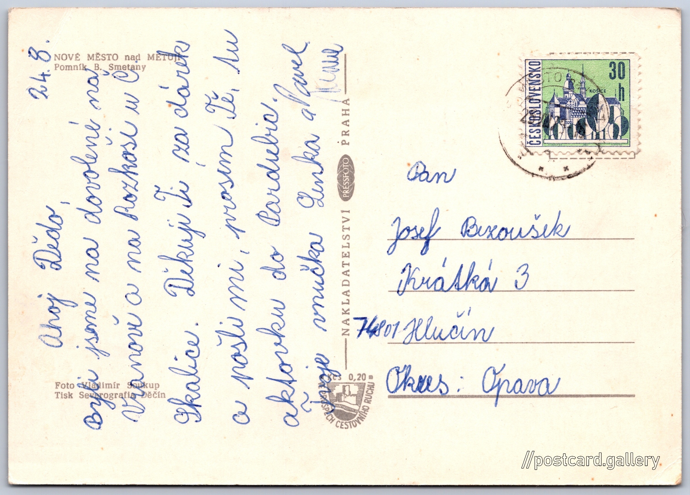 Nové Město nad Metují, Pomník Bedřicha Smetany Pokud chcete vidět pohlednice ve vyšším rozlišení nebo zobrazovat jejich zadní stranu, tak se prosím nejdříve přihlašte Přihlásit Zaregistrovat NOVÉ MĚSTO nad METUJÍPomník B. Smeteny Jazyk tištěného textu na pohlednici: čeština Socha Bedřicha Smetany, Socha, Nové Město nad Metují, Česko ukázat na mapě V blízkém okolí místa zobrazeného na pohlednici lze najít 8 jiných pohlednic. Zobrazit blízké pohlednice Vydavatel: PressFoto Praha (Československo) Datum vydání není známo Pomozte nám odhadnout datum vzniku pohlednice Velikost (š x v) a tvar pohlednice: 148 x 105 mm (5.83" x 4.13"), obdélník Osoby spjaté s touto pohlednicí: Vladimír Soukup(Autor fotografie) Bedřich Smetana(Obsah pohlednice) Prošlá poštou Ceny: Příplatek na tur. ruch: 0,20 Kčs (CSK))Vyplacené známky: 0,30 Kčs (CSK) DiskuseVložit příspěvek Přidat novou složku ... Spravovat složky ...
