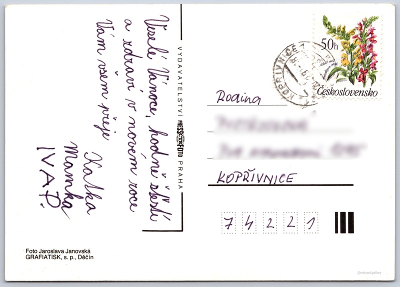 Novoroční přání Pokud chcete vidět pohlednice ve vyšším rozlišení nebo zobrazovat jejich zadní stranu, tak se prosím nejdříve přihlašte Přihlásit Zaregistrovat šťastný nový rok Jazyk tištěného textu na pohlednici: čeština Vydavatel: PressFoto Praha (Československo) Odhadované datum vydání pohlednice: 1988 - 1991 Pomozte nám zpřesnit rok vzniku pohlednice Velikost (š x v) a tvar pohlednice: 148 x 105 mm (5.83" x 4.13"), obdélník Osoby spjaté s touto pohlednicí: Jaroslava Janovská(Autor fotografie) Prošlá poštou:Datum na razítku: 20.12.1991 Ceny: Vyplacené známky: 0,50 Kčs (CSK) DiskuseVložit příspěvek Přidat novou složku ... Spravovat složky ...