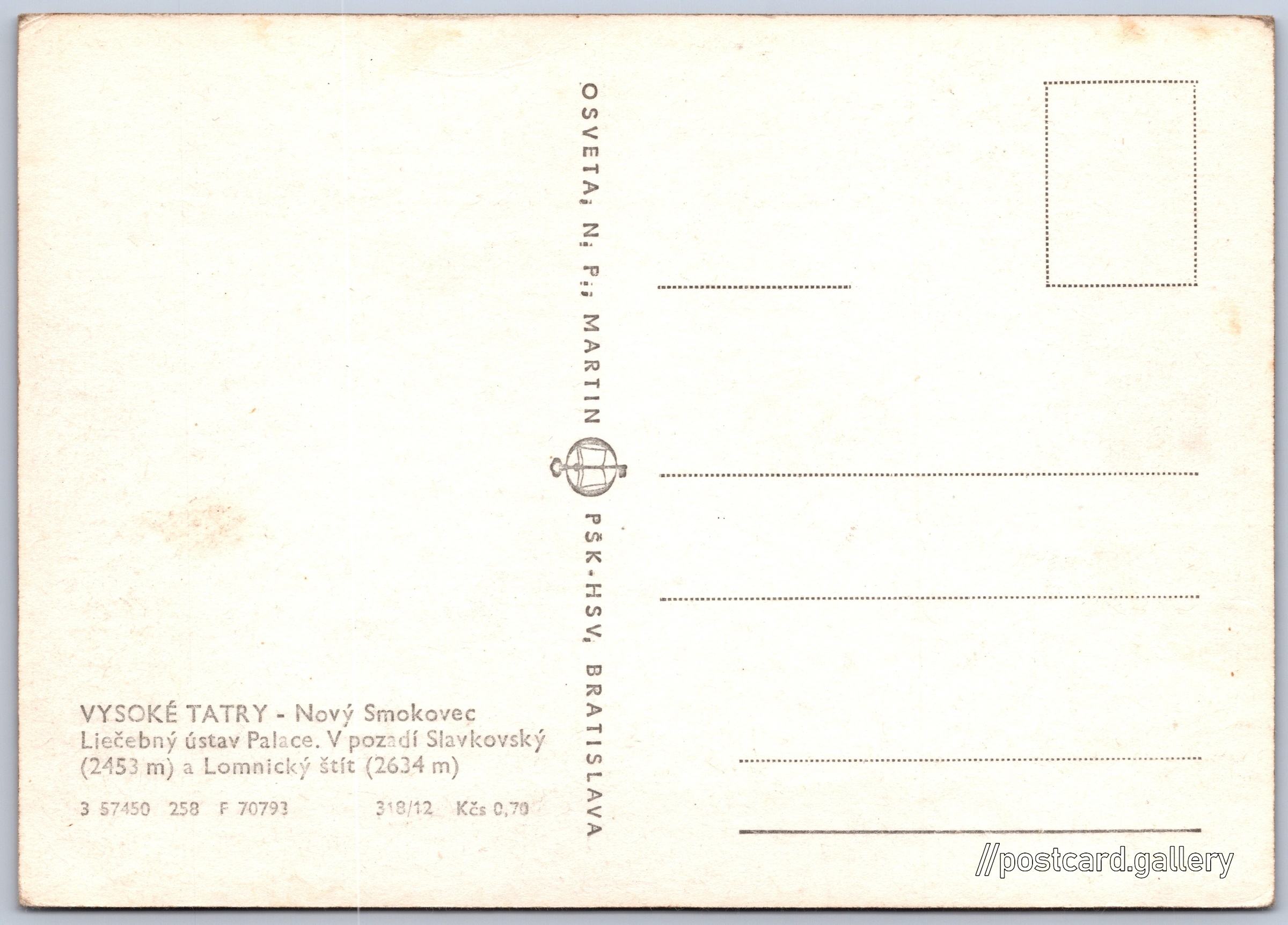 Nový Smokovec, léčebný ústav Palace Pokud chcete vidět pohlednice ve vyšším rozlišení nebo zobrazovat jejich zadní stranu, tak se prosím nejdříve přihlašte Přihlásit Zaregistrovat VYSOKÉ TATRY - Nový SmokovecLiečebný ústav Palace. V pozadí Slavkovský (2453 m) a Lomnický štít (2634 m) Jazyk tištěného textu na pohlednici: slovenština Starý Smokovec 32 ukázat na mapě V blízkém okolí místa zobrazeného na pohlednici lze najít 62 jiných pohlednic. Zobrazit blízké pohlednice Vydavatel: Osveta, n. p., Martin PŠK - Bratislava (Československo) Rok vydání pohlednice: únor, 1958 Velikost (š x v) a tvar pohlednice: 146 x 104 mm (5.75" x 4.09"), obdélník Čistá pohlednice (neprošlá poštou) Ceny: Cena pohlednice: 0,70 Kčs (CSK) Kódy na pohlednici: 3 57450 258 F 70793 318/12 DiskuseVložit příspěvek Přidat novou složku ... Spravovat složky ...