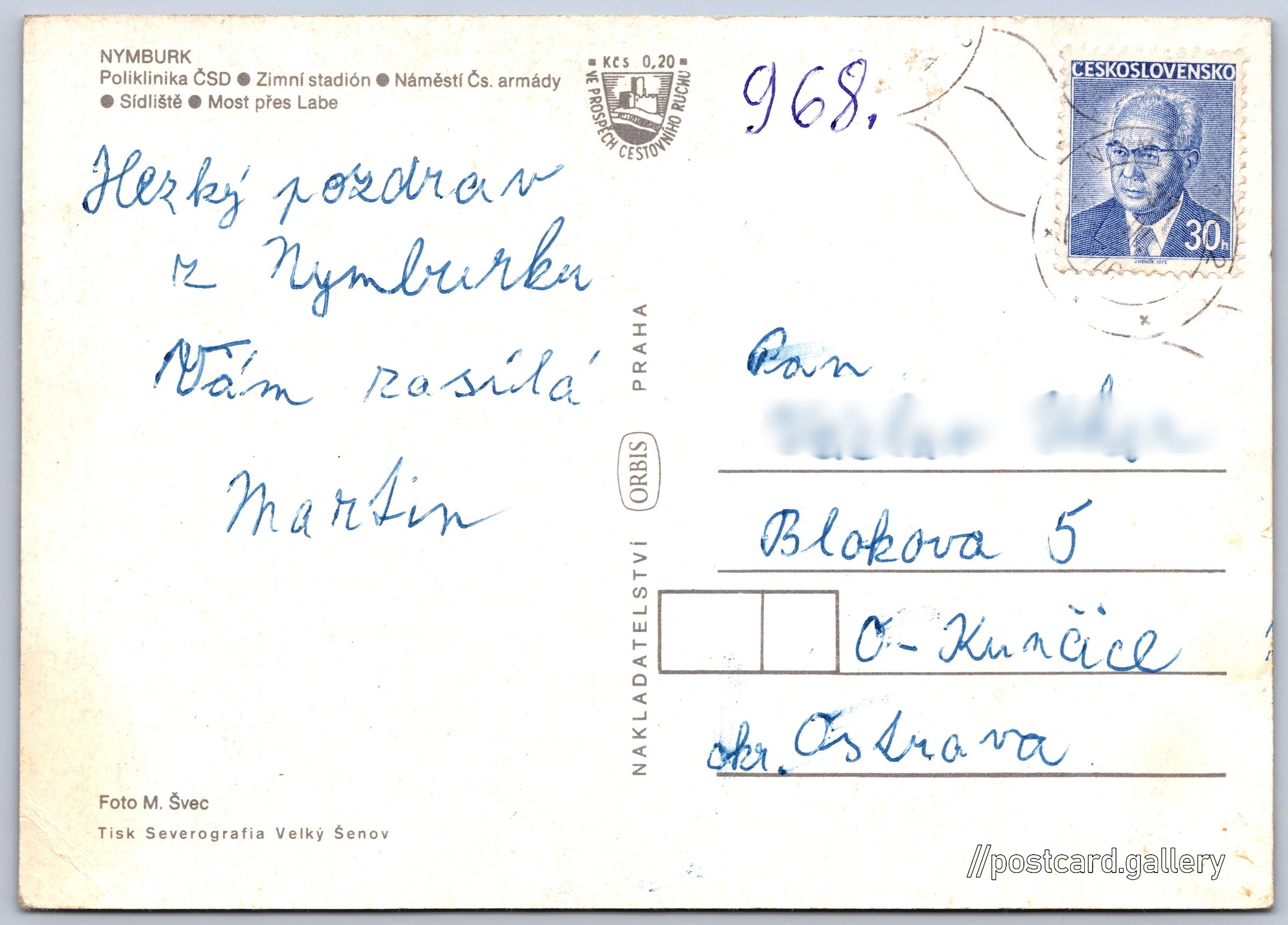 Nymburk Pokud chcete vidět pohlednice ve vyšším rozlišení nebo zobrazovat jejich zadní stranu, tak se prosím nejdříve přihlašte Přihlásit Zaregistrovat Nymburk NYMBURK- Poliklinika ČSD- Zimní stadión- Náměstí Čs. armády- Sídliště- Most přes Labe Jazyk tištěného textu na pohlednici: čeština Boleslavská třída 1854/14, Nymburk, 288 02, Nymburk ukázat na mapě Vydavatel: Nakladatelství Orbis (Československo) Datum vydání není známo Pomozte nám odhadnout datum vzniku pohlednice Velikost (š x v) a tvar pohlednice: 147 x 105 mm (5.79" x 4.13"), obdélník Osoby spjaté s touto pohlednicí: M. Švec(Autor fotografie) Prošlá poštou Ceny: Příplatek na tur. ruch: 0,20 Kčs (CSK))Vyplacené známky: 0,30 Kčs (CSK) DiskuseVložit příspěvek Přidat novou složku ... Spravovat složky ...