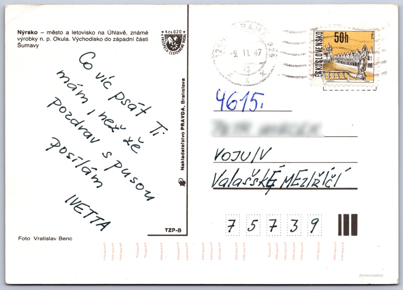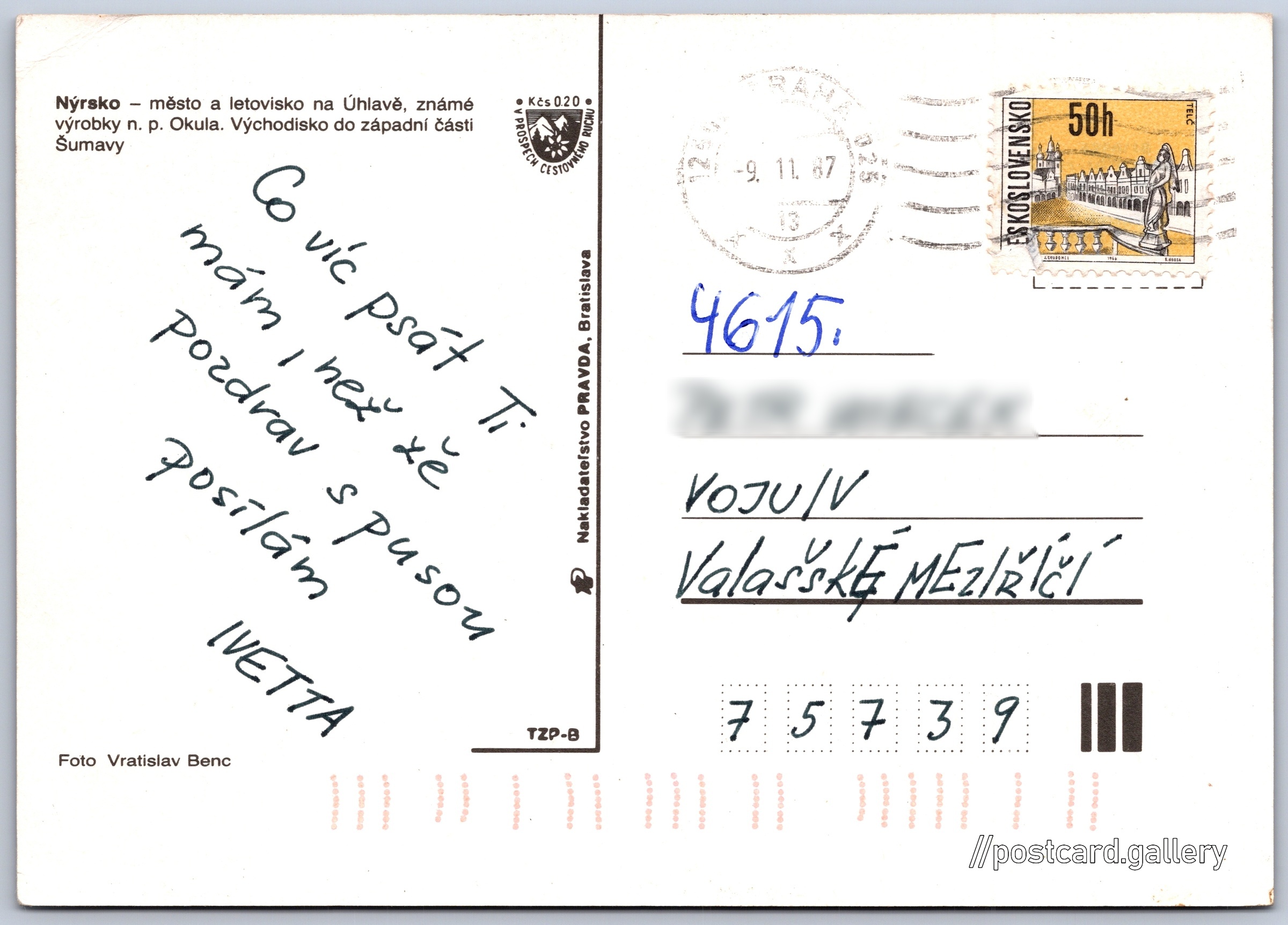 Nýrsko Pokud chcete vidět pohlednice ve vyšším rozlišení nebo zobrazovat jejich zadní stranu, tak se prosím nejdříve přihlašte Přihlásit Zaregistrovat Nýrsko Nýrsko - město a letovisko na Úhlavě, známé výrobky n. p. Okula. Východisko do západní části Šumavy Jazyk tištěného textu na pohlednici: čeština Náměstí 81, Nýrsko, 340 22, Klatovy ukázat na mapě Vydavatel: Nakladateľstvo PRAVDA, Bratislava (Československo) Odhadované datum vydání pohlednice: 1984 - 1987 Pomozte nám zpřesnit rok vzniku pohlednice Velikost (š x v) a tvar pohlednice: 149 x 105 mm (5.87" x 4.13"), obdélník Osoby spjaté s touto pohlednicí: Vratislav Benc(Autor fotografie) Prošlá poštou:Datum na razítku: 9.11.1987 Ceny: Příplatek na tur. ruch: 0,20 Kčs (CSK))Vyplacené známky: 0,50 Kčs (CSK) DiskuseVložit příspěvek Přidat novou složku ... Spravovat složky ...