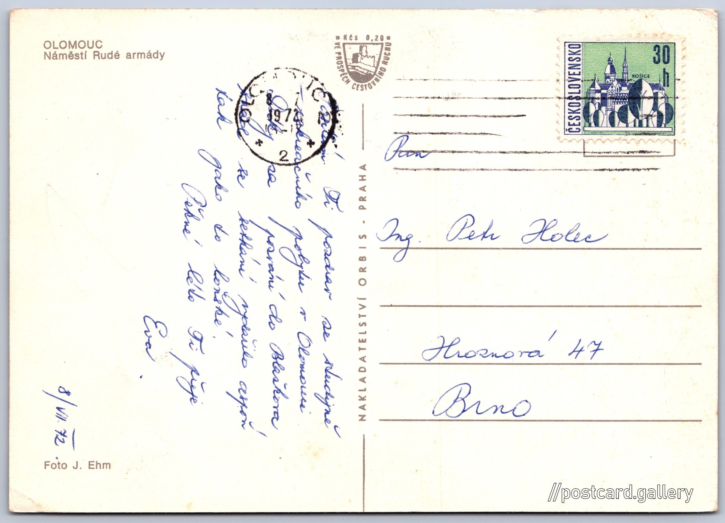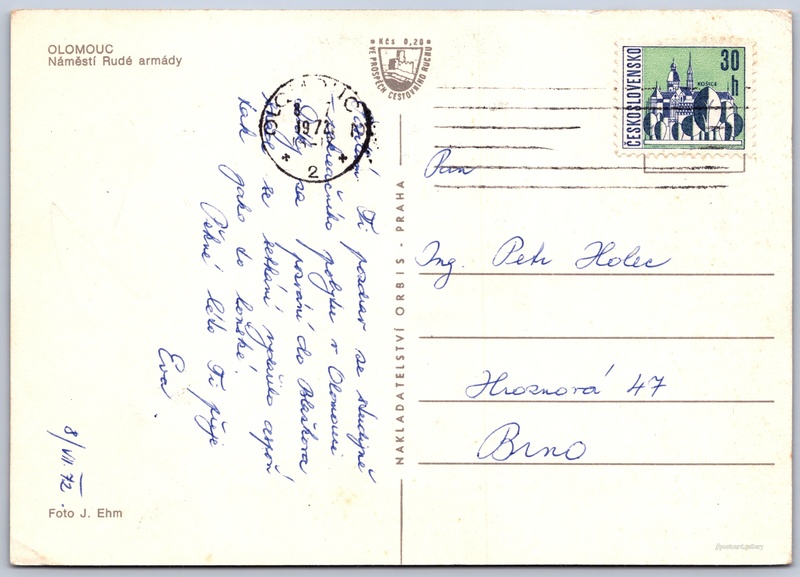 Olomouc, Náměstí Rudé armády Pokud chcete vidět pohlednice ve vyšším rozlišení nebo zobrazovat jejich zadní stranu, tak se prosím nejdříve přihlašte Přihlásit Zaregistrovat OLOMOUCNáměstí Rudé armády Jazyk tištěného textu na pohlednici: čeština Dolní náměstí 27/38, Olomouc, 779 00, Olomouc ukázat na mapě V blízkém okolí místa zobrazeného na pohlednici lze najít 27 jiných pohlednic. Zobrazit blízké pohlednice Vydavatel: Nakladatelství Orbis (Československo) Odhadované datum vydání pohlednice: 1969 - 1972 Pomozte nám zpřesnit rok vzniku pohlednice Velikost (š x v) a tvar pohlednice: 147 x 104 mm (5.79" x 4.09"), obdélník Osoby spjaté s touto pohlednicí: Josef Ehm(Autor fotografie) Prošlá poštou:Datum na razítku: 8.7.1972Datum napsání pohledu: 8.7.1972 Ceny: Příplatek na tur. ruch: 0,20 Kčs (CSK))Vyplacené známky: 0,30 Kčs (CSK) DiskuseVložit příspěvek Přidat novou složku ... Spravovat složky ...