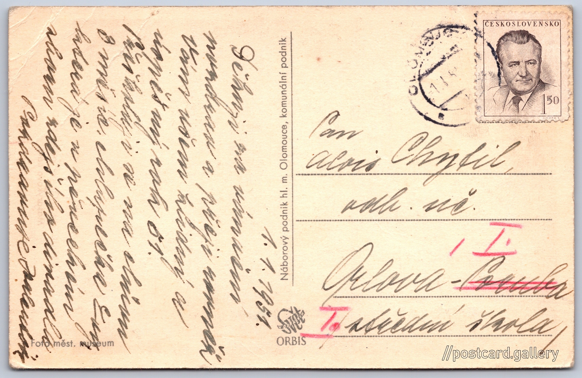 Olomouc, náměstí Pokud chcete vidět pohlednice ve vyšším rozlišení nebo zobrazovat jejich zadní stranu, tak se prosím nejdříve přihlašte Přihlásit Zaregistrovat OLOMOUC NA MORAVĚ NEJPAMÁTNEJŠIMasarykovo nám. Foto měst. muzeum Jazyk tištěného textu na pohlednici: čeština Horní náměstí, Olomouc, Olomouc ukázat na mapě V blízkém okolí místa zobrazeného na pohlednici lze najít 27 jiných pohlednic. Zobrazit blízké pohlednice Vydavatel: Nakladatelství Orbis (Československo)Náborový podnik hl. m. Olomouce (Československo) Odhadované datum vydání pohlednice: 1948 - 1951 Pomozte nám zpřesnit rok vzniku pohlednice Velikost (š x v) a tvar pohlednice: 139 x 89 mm (5.47" x 3.50"), obdélník Prošlá poštou:Datum na razítku: 1.1.1951Datum napsání pohledu: 1.1.1951 Ceny: Vyplacené známky: 1,50 Kčs (CSK) DiskuseVložit příspěvek Přidat novou složku ... Spravovat složky ...