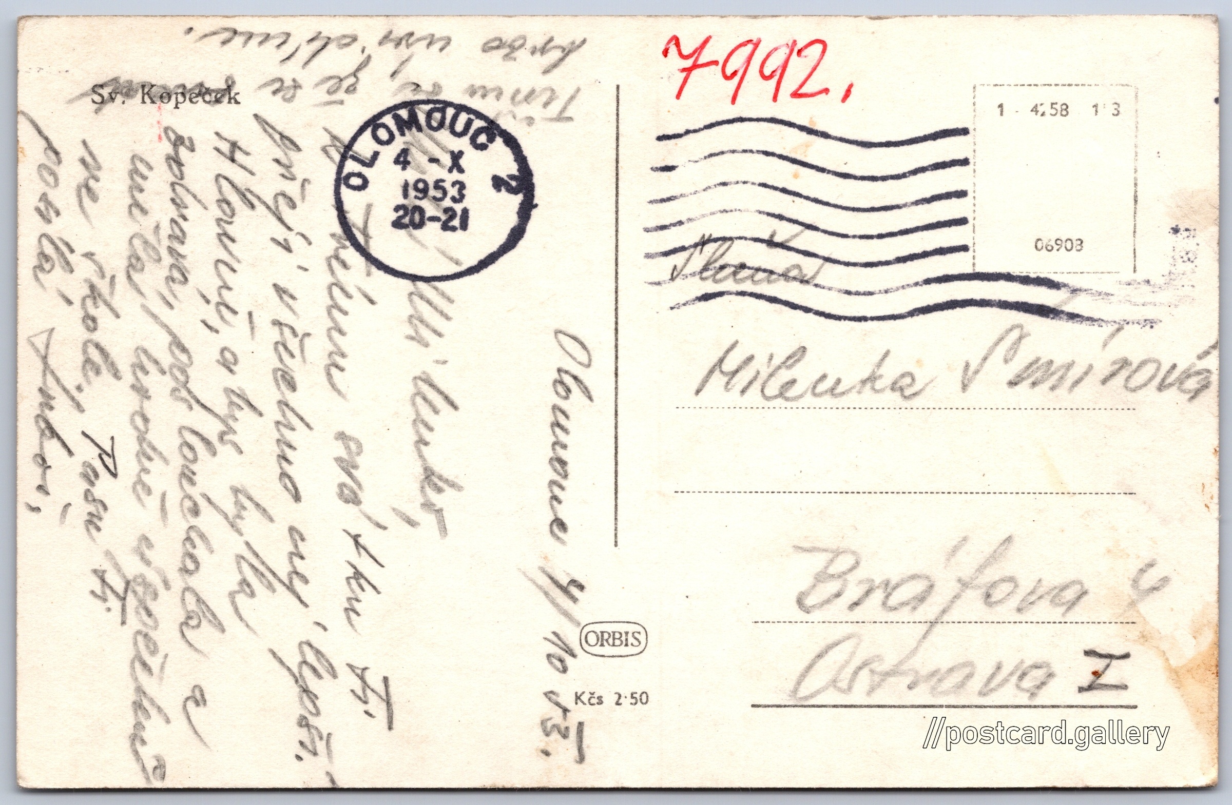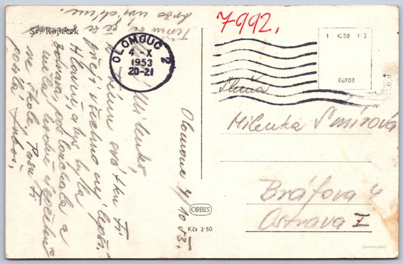 Olomouc, Svatý kopeček Pokud chcete vidět pohlednice ve vyšším rozlišení nebo zobrazovat jejich zadní stranu, tak se prosím nejdříve přihlašte Přihlásit Zaregistrovat Sv, Kopeček Jazyk tištěného textu na pohlednici: čeština Návrší Jana Pavla II., Olomouc, Olomouc ukázat na mapě V blízkém okolí místa zobrazeného na pohlednici lze najít 4 jiné pohlednice. Zobrazit blízké pohlednice Vydavatel: Nakladatelství Orbis (Československo) Rok vydání pohlednice: leden, 1953 Velikost (š x v) a tvar pohlednice: 140 x 90 mm (5.51" x 3.54"), obdélník Prošlá poštou:Datum na razítku: 4.10.1953Datum napsání pohledu: 4.10.1953 Ceny: Cena pohlednice: 2,50 Kčs (CSK) Kódy na pohlednici: 1-4258 153 06903 DiskuseVložit příspěvek Přidat novou složku ... Spravovat složky ...