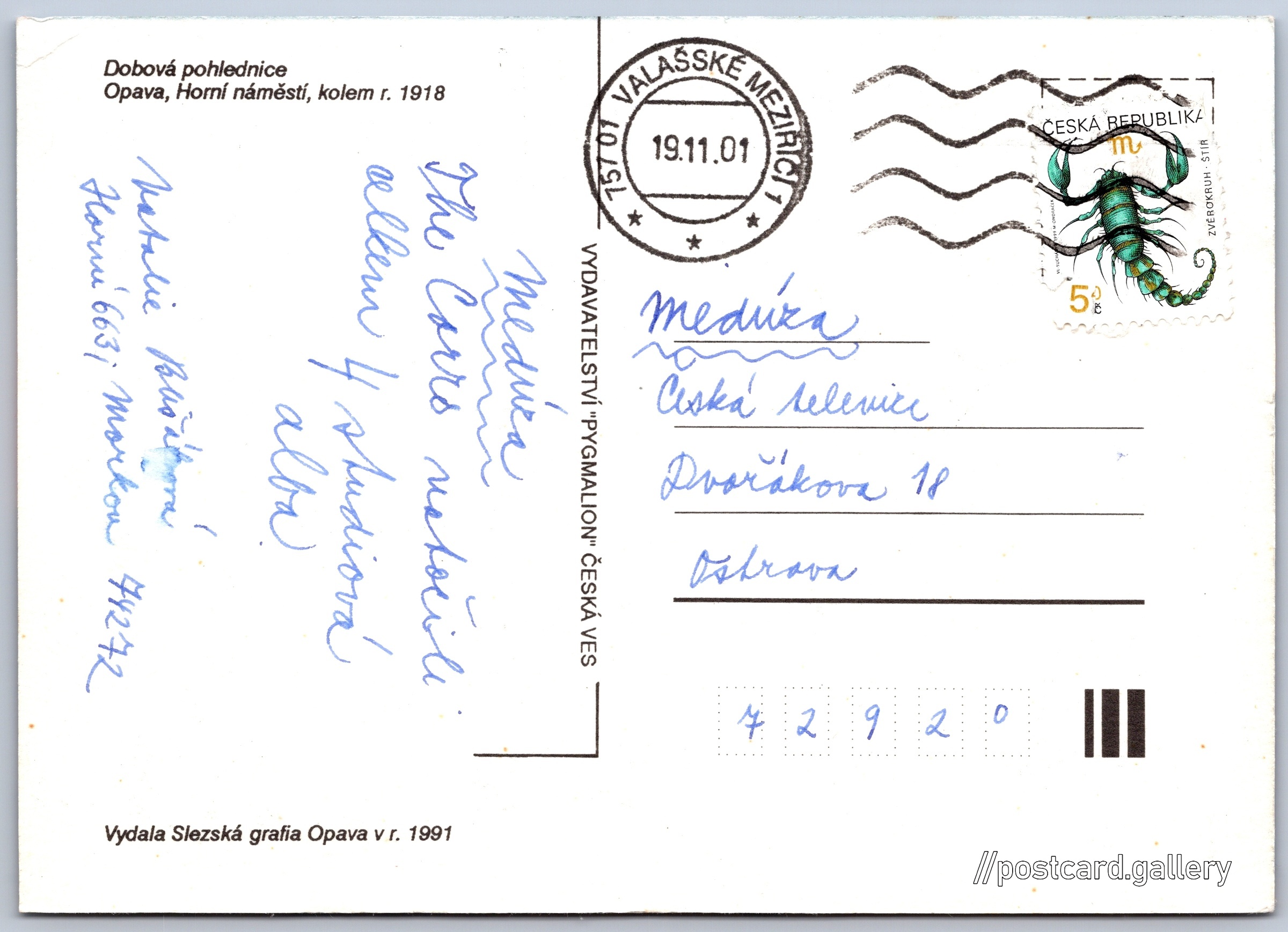 Opava, městské divadlo, dobová pohlednice Pokud chcete vidět pohlednice ve vyšším rozlišení nebo zobrazovat jejich zadní stranu, tak se prosím nejdříve přihlašte Přihlásit Zaregistrovat Troppau. Oberring mit Stadttheater. Dobová pohledniceOpava, Horní náměstí, kolem r. 1918Vydala Slezská grafia Opava v r. 1991 Jazyk tištěného textu na pohlednici: čeština Horní náměstí, Opava, Opava ukázat na mapě V blízkém okolí místa zobrazeného na pohlednici lze najít 4 jiné pohlednice. Zobrazit blízké pohlednice Vydavatel: Pygmalion, Česká Ves (Československo) Odhadované datum vydání pohlednice: 1998 - 2001 Pomozte nám zpřesnit rok vzniku pohlednice Velikost (š x v) a tvar pohlednice: 147 x 105 mm (5.79" x 4.13"), obdélník Prošlá poštou:Datum na razítku: 19.11.2001 Ceny: Vyplacené známky: 5,40 Kč (CZK) DiskuseVložit příspěvek Přidat novou složku ... Spravovat složky ...