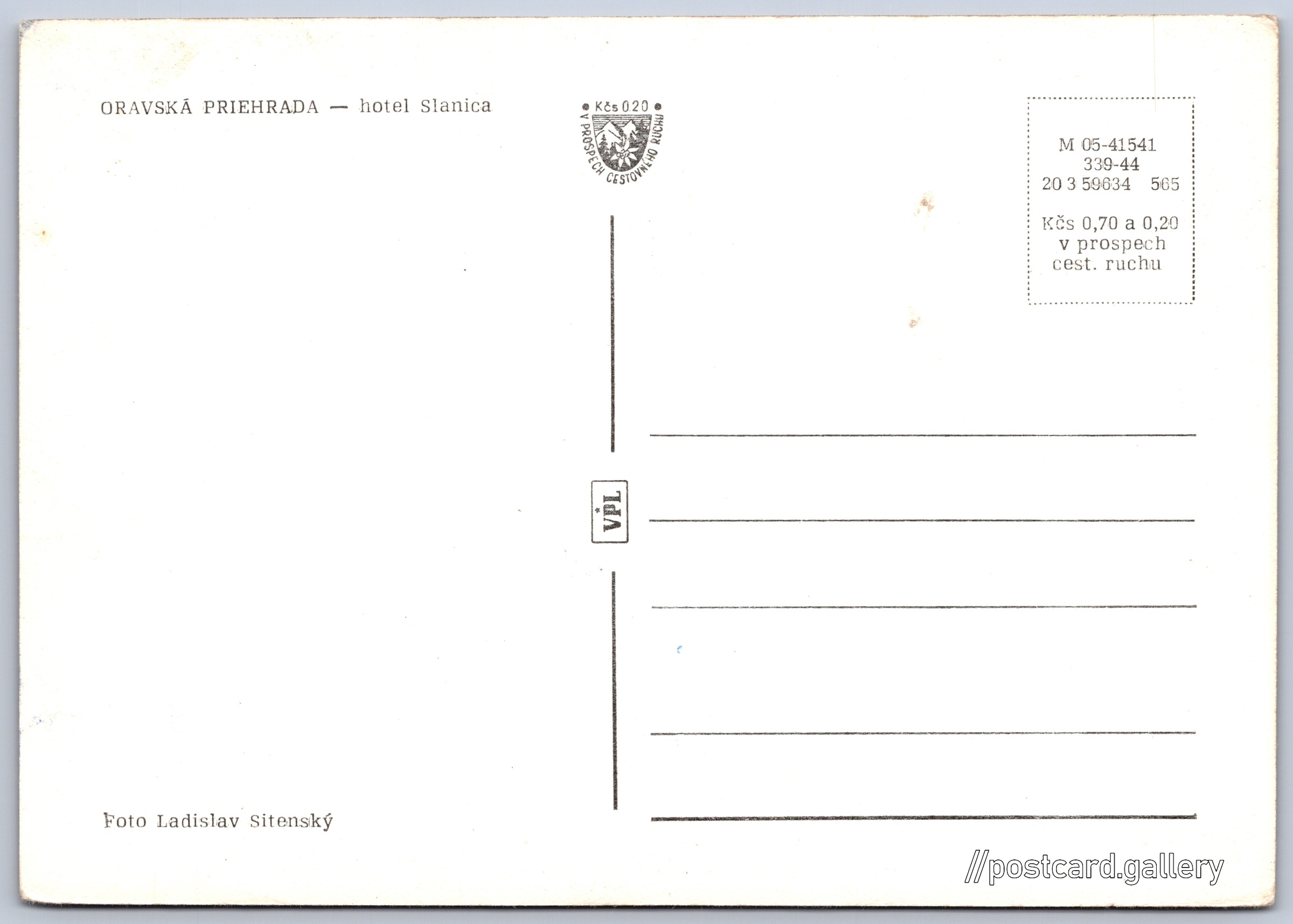 Oravská přehrada, hotel Slanica Pokud chcete vidět pohlednice ve vyšším rozlišení nebo zobrazovat jejich zadní stranu, tak se prosím nejdříve přihlašte Přihlásit Zaregistrovat ORAVSKÁ PRIEHRADA - hotel Slanica Jazyk tištěného textu na pohlednici: slovenština Hotel Slanica, Slanická osada 2181, Námestovo - Slanica, Slovensko ukázat na mapě V blízkém okolí místa zobrazeného na pohlednici lze najít 10 jiných pohlednic. Zobrazit blízké pohlednice Vydavatel: VPL (Československo) Rok vydání pohlednice: květen, 1965 Velikost (š x v) a tvar pohlednice: 146 x 103 mm (5.75" x 4.06"), obdélník Osoby spjaté s touto pohlednicí: Ladislav Sitenský(Autor fotografie) Čistá pohlednice (neprošlá poštou) Ceny: Cena pohlednice: 0,70 Kčs (CSK) (+0,20 Kčs přípl. na tur. ruch) Kódy na pohlednici: M 05-41541 339-44 20 3 59634 565 DiskuseVložit příspěvek Přidat novou složku ... Spravovat složky ...
