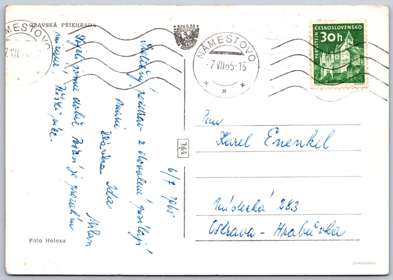 Oravská přehrada Pokud chcete vidět pohlednice ve vyšším rozlišení nebo zobrazovat jejich zadní stranu, tak se prosím nejdříve přihlašte Přihlásit Zaregistrovat ORAVSKÁ PRIEHRADA Jazyk tištěného textu na pohlednici: slovenština Oravská přehrada, Vodní plocha, Trstená, Slovensko ukázat na mapě Přesné místo není známo. Pokud jej znáte, tak jej prosím napište do komentářů nebo označte na mapě Vydavatel: VPL (Československo) Odhadované datum vydání pohlednice: 1962 - 1965 Pomozte nám zpřesnit rok vzniku pohlednice Velikost (š x v) a tvar pohlednice: 145 x 102 mm (5.71" x 4.02"), obdélník Osoby spjaté s touto pohlednicí: Rudolf Helexa(Autor fotografie) Prošlá poštou:Datum na razítku: 7.7.1965Datum napsání pohledu: 6.7.1965 Ceny: Příplatek na tur. ruch: 0,20 Kčs (CSK))Vyplacené známky: 0,30 Kčs (CSK) DiskuseVložit příspěvek Přidat novou složku ... Spravovat složky ...