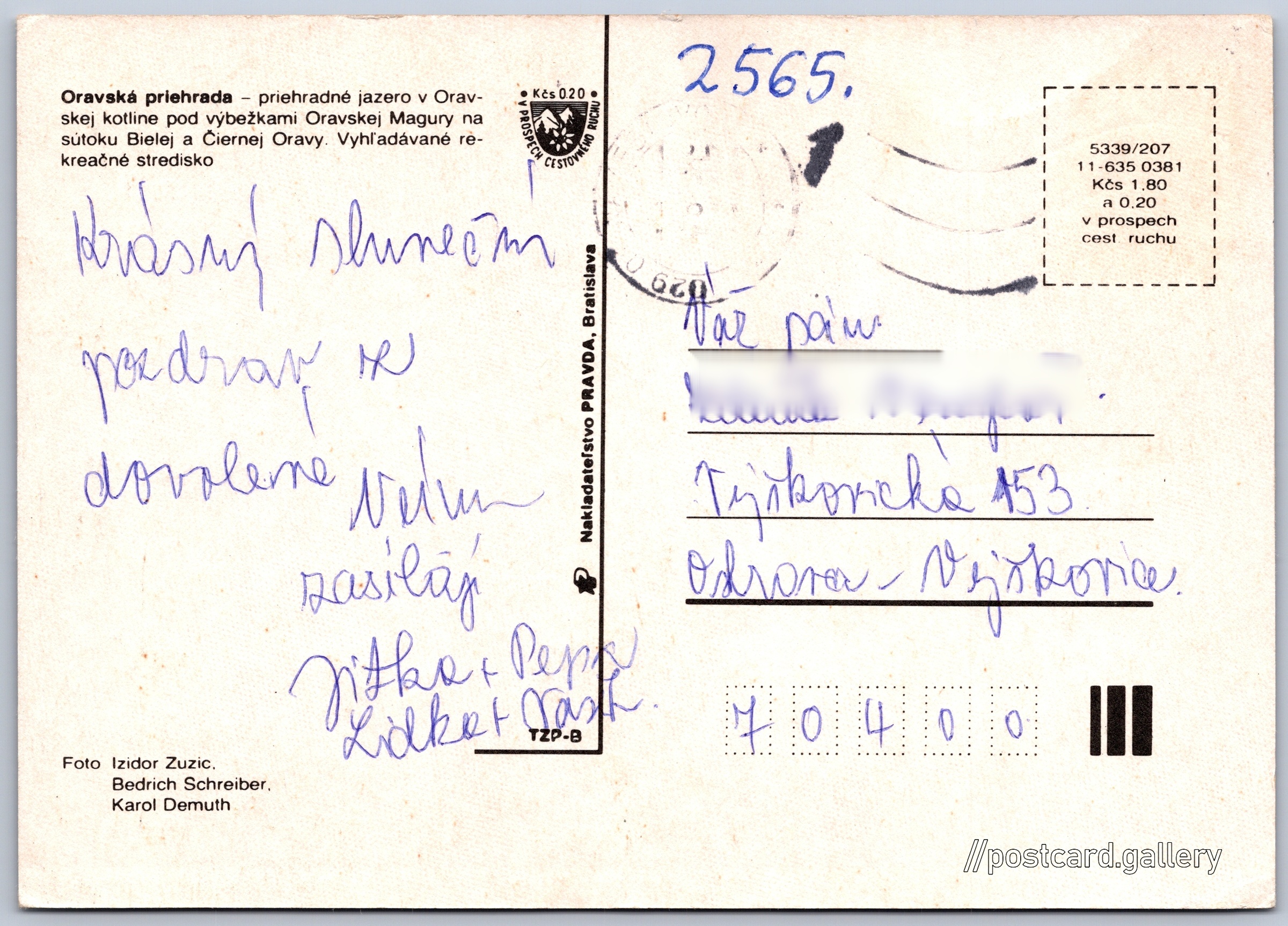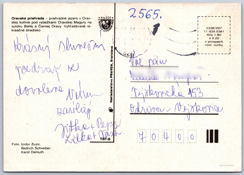 Oravská přehrada Pokud chcete vidět pohlednice ve vyšším rozlišení nebo zobrazovat jejich zadní stranu, tak se prosím nejdříve přihlašte Přihlásit Zaregistrovat Oravská priehrada Oravská priehrada - priehradné jazero v Oravskej kotline pod výbežkami Oravskej Magury na sútoku Bielej a Čiernej Oravy. Vyhľadávané rekreačné stredisko Jazyk tištěného textu na pohlednici: slovenština Oravská přehrada, Vodní plocha, Trstená, Slovensko ukázat na mapě Vydavatel: Nakladateľstvo PRAVDA, Bratislava (Československo) Rok vydání pohlednice: březen, 1981 Velikost (š x v) a tvar pohlednice: 143 x 105 mm (5.63" x 4.13"), obdélník Osoby spjaté s touto pohlednicí: Bedrich Schreiber(Autor fotografie) Izidor Zuzic(Autor fotografie) Karol Demuth(Autor fotografie) Prošlá poštou Ceny: Cena pohlednice: 1,80 Kčs (CSK) (+0,20 Kčs přípl. na tur. ruch) Kódy na pohlednici: 5339/207 11-635 0381 DiskuseVložit příspěvek Přidat novou složku ... Spravovat složky ...