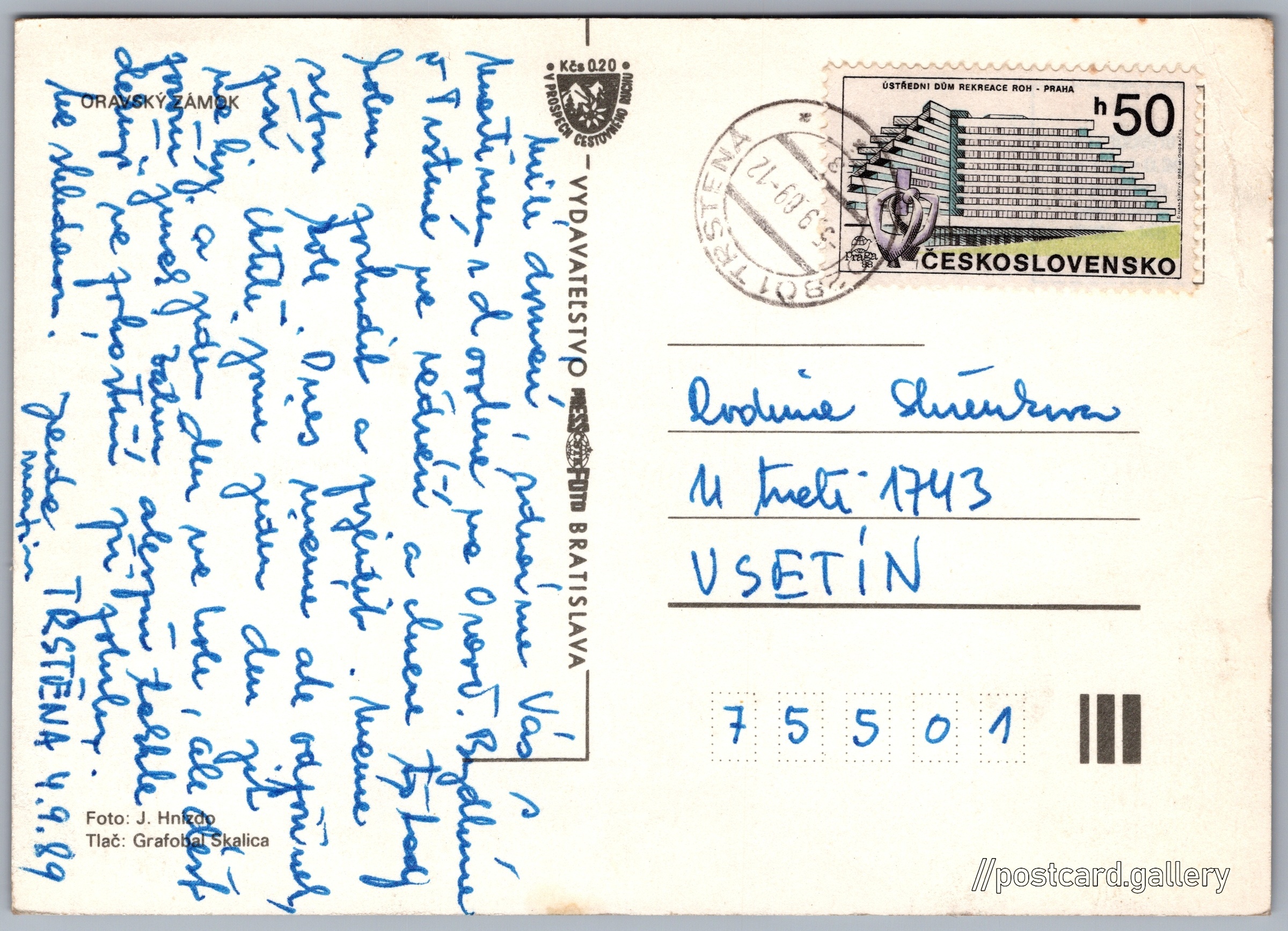 Oravská zámok Pokud chcete vidět pohlednice ve vyšším rozlišení nebo zobrazovat jejich zadní stranu, tak se prosím nejdříve přihlašte Přihlásit Zaregistrovat ORAVSKÝ ZÁMOK Jazyk tištěného textu na pohlednici: čeština Oravský hrad, Hrad, Oravský Podzámok 1, Oravský Podzámok, Slovensko ukázat na mapě V blízkém okolí místa zobrazeného na pohlednici lze najít 11 jiných pohlednic. Zobrazit blízké pohlednice Vydavatel: PressFoto Bratislava (Československo) Odhadované datum vydání pohlednice: 1986 - 1989 Pomozte nám zpřesnit rok vzniku pohlednice Velikost (š x v) a tvar pohlednice: 148 x 105 mm (5.83" x 4.13"), obdélník Osoby spjaté s touto pohlednicí: J. K. Hnízdo(Autor fotografie) Prošlá poštou:Datum na razítku: 5.9.1989Datum napsání pohledu: 4.9.1989 Ceny: Příplatek na tur. ruch: 0,20 Kčs (CSK))Vyplacené známky: 0,50 Kčs (CSK) DiskuseVložit příspěvek Přidat novou složku ... Spravovat složky ...
