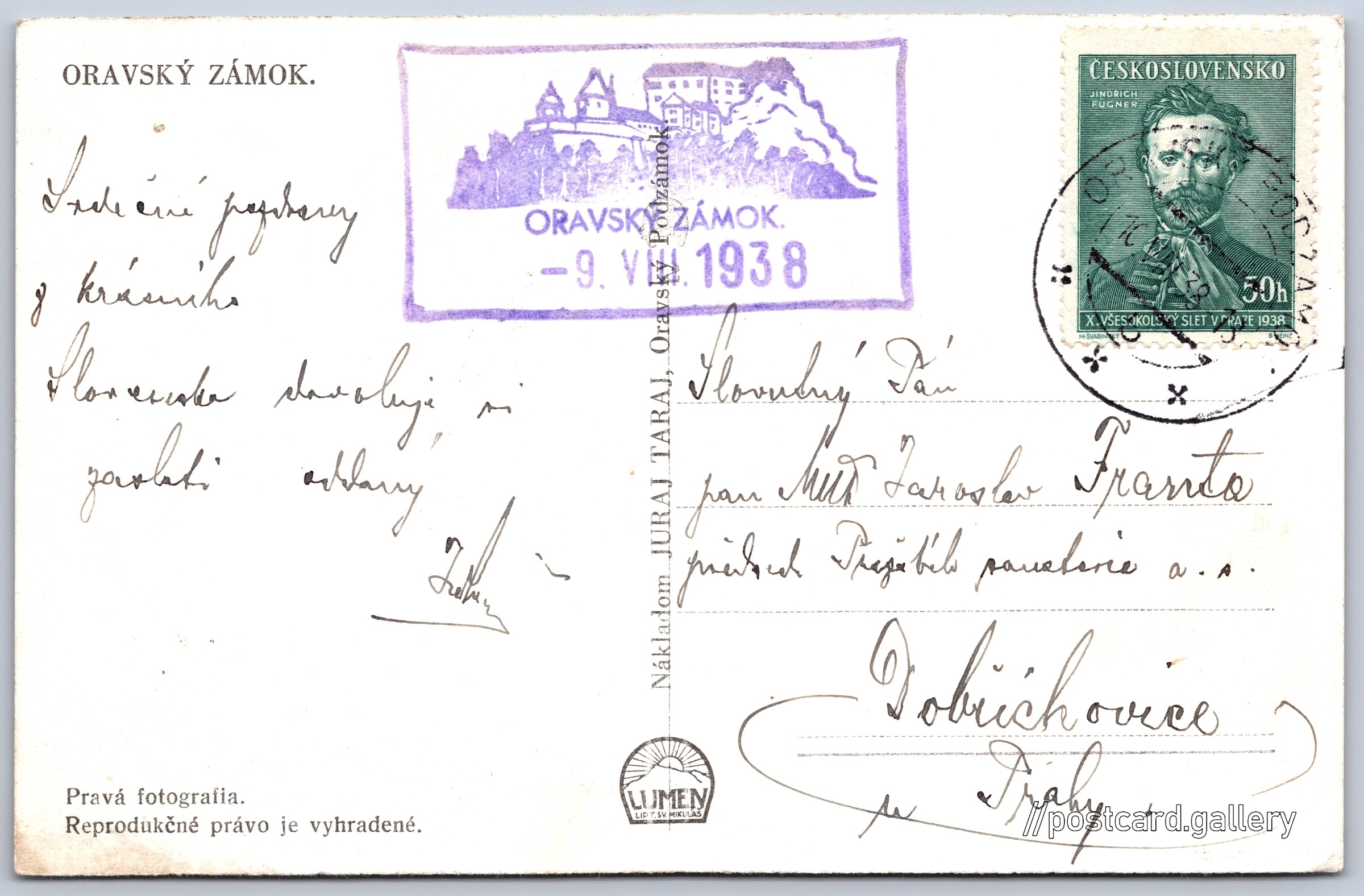 Oravský hrad 10/35 Pokud chcete vidět pohlednice ve vyšším rozlišení nebo zobrazovat jejich zadní stranu, tak se prosím nejdříve přihlašte Přihlásit Zaregistrovat ORAVSKÝ ZÁMOK.Pravá fotografia. Jazyk tištěného textu na pohlednici: slovenština Oravský hrad, Hrad, Oravský Podzámok 1, Oravský Podzámok, Slovensko ukázat na mapě V blízkém okolí místa zobrazeného na pohlednici lze najít 11 jiných pohlednic. Zobrazit blízké pohlednice Vydavatel: Lumen (Československo)Juraj Taraj (Československo) Odhadované datum vydání pohlednice: 1935 - 1938 Pomozte nám zpřesnit rok vzniku pohlednice Velikost (š x v) a tvar pohlednice: 140 x 90 mm (5.51" x 3.54"), obdélník Prošlá poštou:Datum na razítku: 9.8.1938 Ceny: Vyplacené známky: 0,50 Kčs (CSK) DiskuseVložit příspěvek Přidat novou složku ... Spravovat složky ...