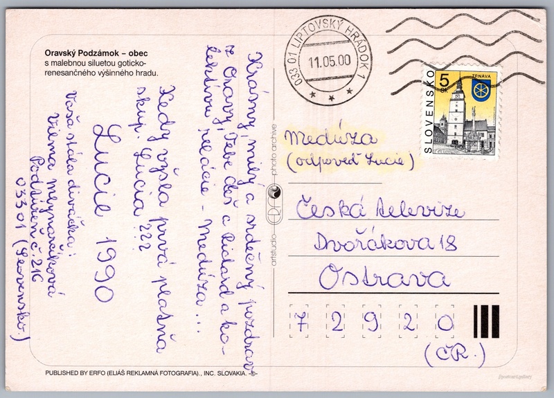 Oravský zámok Pokud chcete vidět pohlednice ve vyšším rozlišení nebo zobrazovat jejich zadní stranu, tak se prosím nejdříve přihlašte Přihlásit Zaregistrovat Oravský zámok Oravský Podzámok - obec s malebnou siluetou goticko-renesančného výšinného hradu. Jazyk tištěného textu na pohlednici: slovenština Oravský Podzámok, Vesnice, Slovensko ukázat na mapě V blízkém okolí místa zobrazeného na pohlednici lze najít 11 jiných pohlednic. Zobrazit blízké pohlednice Vydavatel: Artstudio Erfo (Slovensko) Odhadované datum vydání pohlednice: 1997 - 2000 Pomozte nám zpřesnit rok vzniku pohlednice Velikost (š x v) a tvar pohlednice: 149 x 105 mm (5.87" x 4.13"), obdélník Prošlá poštou:Datum na razítku: 11.5.2000 Ceny: Vyplacené známky: 5,00 Sk (SKK) DiskuseVložit příspěvek Přidat novou složku ... Spravovat složky ...
