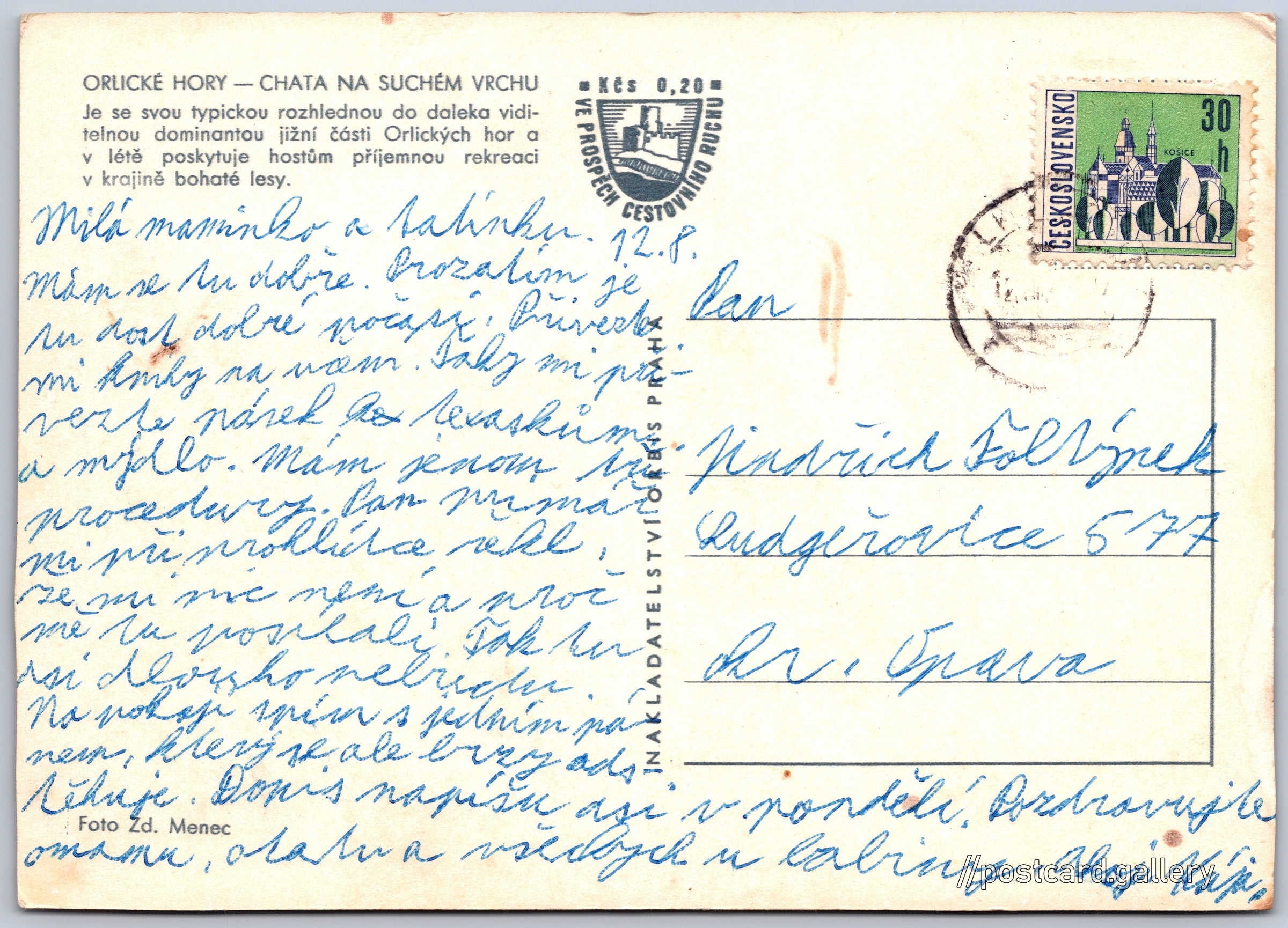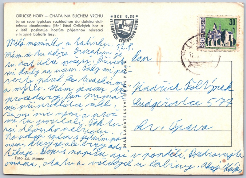 Orlické hory, chata na Suchém vrchu Pokud chcete vidět pohlednice ve vyšším rozlišení nebo zobrazovat jejich zadní stranu, tak se prosím nejdříve přihlašte Přihlásit Zaregistrovat ORLICKÉ HORY - CHATA NA SUCHÉM VRCHUJe se svou typickou rozhlednou do daleka viditelnou dominantou jižní části Orlických hor a v létě poskytuje hostům příjemnou rekreaci v krajině bohaté lesy. Jazyk tištěného textu na pohlednici: čeština Kramářova chata na Suchém vrchu, Orličky 186, Orličky, Česko ukázat na mapě Vydavatel: Nakladatelství Orbis (Československo) Datum vydání není známo Pomozte nám odhadnout datum vzniku pohlednice Velikost (š x v) a tvar pohlednice: 149 x 106 mm (5.87" x 4.17"), obdélník Osoby spjaté s touto pohlednicí: Zdeněk Menec(Autor fotografie) Prošlá poštou Ceny: Příplatek na tur. ruch: 0,20 Kčs (CSK))Vyplacené známky: 0,30 Kčs (CSK) DiskuseVložit příspěvek Přidat novou složku ... Spravovat složky ...