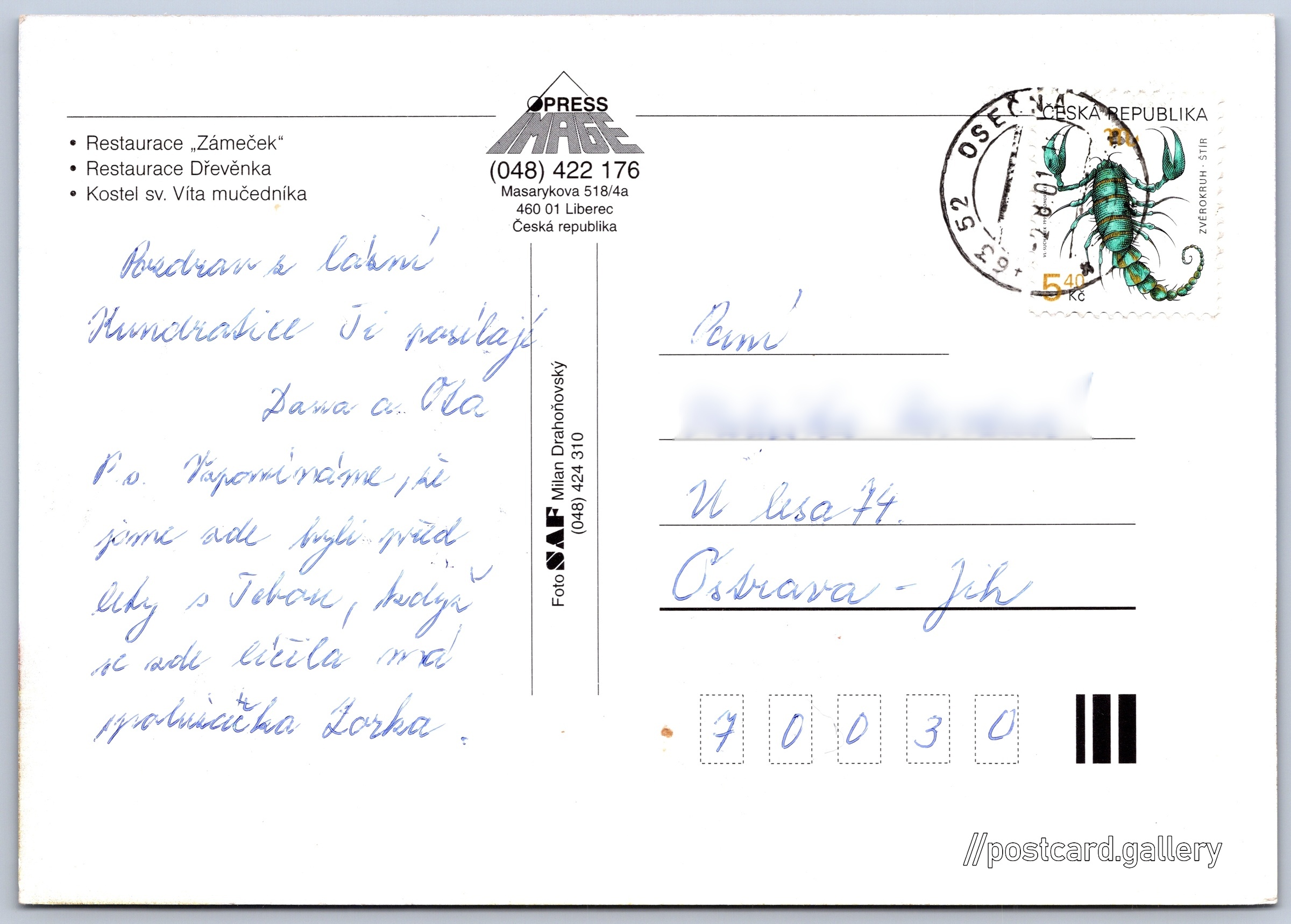 Osečná Pokud chcete vidět pohlednice ve vyšším rozlišení nebo zobrazovat jejich zadní stranu, tak se prosím nejdříve přihlašte Přihlásit Zaregistrovat Osečná - Restaurace "Zámeček"- Restaurace Dřevěnka- Kostel sv. Víta mučedníka Jazyk tištěného textu na pohlednici: čeština Osečná, Město, Česko ukázat na mapě Vydavatel: Press Image (Česko) Odhadované datum vydání pohlednice: 1998 - 2001 Pomozte nám zpřesnit rok vzniku pohlednice Velikost (š x v) a tvar pohlednice: 148 x 104 mm (5.83" x 4.09"), obdélník Osoby spjaté s touto pohlednicí: Milan Drahoňovský(Autor fotografie) Prošlá poštou:Datum na razítku: 2.8.2001 Ceny: Vyplacené známky: 5,40 Kč (CZK) DiskuseVložit příspěvek Přidat novou složku ... Spravovat složky ...