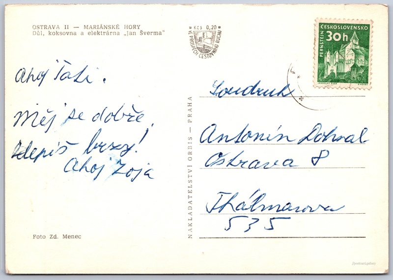 Ostrava, důl, koksovna Jan Šverma 7/46 Pokud chcete vidět pohlednice ve vyšším rozlišení nebo zobrazovat jejich zadní stranu, tak se prosím nejdříve přihlašte Přihlásit Zaregistrovat OSTRAVA II - MARIÁNSKÉ HORYDůl, koksovna a elektrárna "Jan Šverma" Jazyk tištěného textu na pohlednici: čeština Bývalý Důl Jan Šverma (Důl Ignát), Lom, důl - bývalý, Ostrava - Mariánské Hory, Česko ukázat na mapě V blízkém okolí místa zobrazeného na pohlednici lze najít 26 jiných pohlednic. Zobrazit blízké pohlednice Vydavatel: Nakladatelství Orbis (Československo) Odhadované datum vydání pohlednice: 1962 - 1965 Pomozte nám zpřesnit rok vzniku pohlednice Velikost (š x v) a tvar pohlednice: 146 x 102 mm (5.75" x 4.02"), obdélník Osoby spjaté s touto pohlednicí: Zdeněk Menec(Autor fotografie) Jan Šverma(Obsah pohlednice) Prošlá poštou Ceny: Příplatek na tur. ruch: 0,20 Kčs (CSK))Vyplacené známky: 0,30 Kčs (CSK) DiskuseVložit příspěvek Přidat novou složku ... Spravovat složky ...