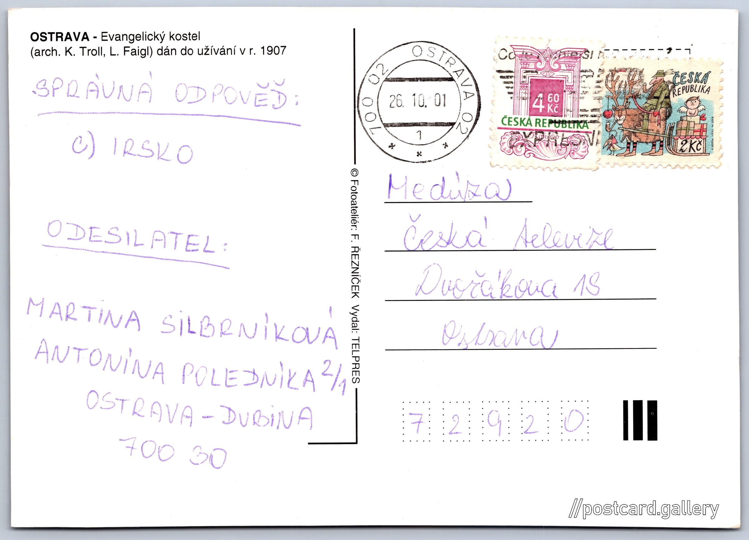 Ostrava, evangelický kostel 9/26 Pokud chcete vidět pohlednice ve vyšším rozlišení nebo zobrazovat jejich zadní stranu, tak se prosím nejdříve přihlašte Přihlásit Zaregistrovat OSTRAVA - Evangelický kostel(arch. K. Troll, L. Faigl) dán do užívání v r. 1907 Jazyk tištěného textu na pohlednici: čeština Evangelický kostel, Kostel, Husovo náměstí, Ostrava, Česko ukázat na mapě V blízkém okolí místa zobrazeného na pohlednici lze najít 26 jiných pohlednic. Zobrazit blízké pohlednice Vydavatel: Telpres (Česko) Odhadované datum vydání pohlednice: 1998 - 2001 Pomozte nám zpřesnit rok vzniku pohlednice Velikost (š x v) a tvar pohlednice: 148 x 105 mm (5.83" x 4.13"), obdélník Osoby spjaté s touto pohlednicí: Karl Troll(Obsah pohlednice) Ludwig Faigl(Obsah pohlednice) Prošlá poštou:Datum na razítku: 26.10.2001 Ceny: Vyplacené známky: 6,60 Kč (CZK) DiskuseVložit příspěvek Přidat novou složku ... Spravovat složky ...