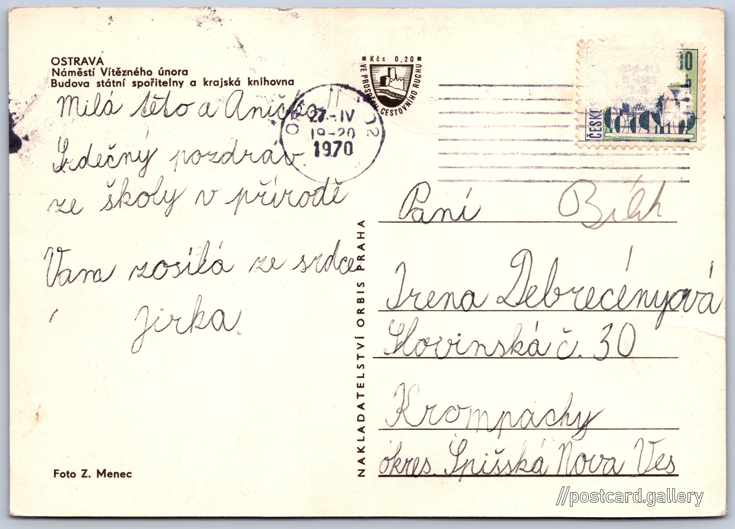 Ostrava, Náměstí Vítězného února Pokud chcete vidět pohlednice ve vyšším rozlišení nebo zobrazovat jejich zadní stranu, tak se prosím nejdříve přihlašte Přihlásit Zaregistrovat OSTRAVANáměstí Vítězného únoraBudova státní spořitelny a krajská knihovna Jazyk tištěného textu na pohlednici: čeština Zámecká, Ostrava, Ostrava-město ukázat na mapě V blízkém okolí místa zobrazeného na pohlednici lze najít 26 jiných pohlednic. Zobrazit blízké pohlednice Vydavatel: Nakladatelství Orbis (Československo) Odhadované datum vydání pohlednice: 1967 - 1970 Pomozte nám zpřesnit rok vzniku pohlednice Velikost (š x v) a tvar pohlednice: 148 x 105 mm (5.83" x 4.13"), obdélník Osoby spjaté s touto pohlednicí: Zdeněk Menec(Autor fotografie) Prošlá poštou:Datum na razítku: 27.4.1970 Ceny: Příplatek na tur. ruch: 0,20 Kčs (CSK))Vyplacené známky: 0,30 Kčs (CSK) DiskuseVložit příspěvek Přidat novou složku ... Spravovat složky ...