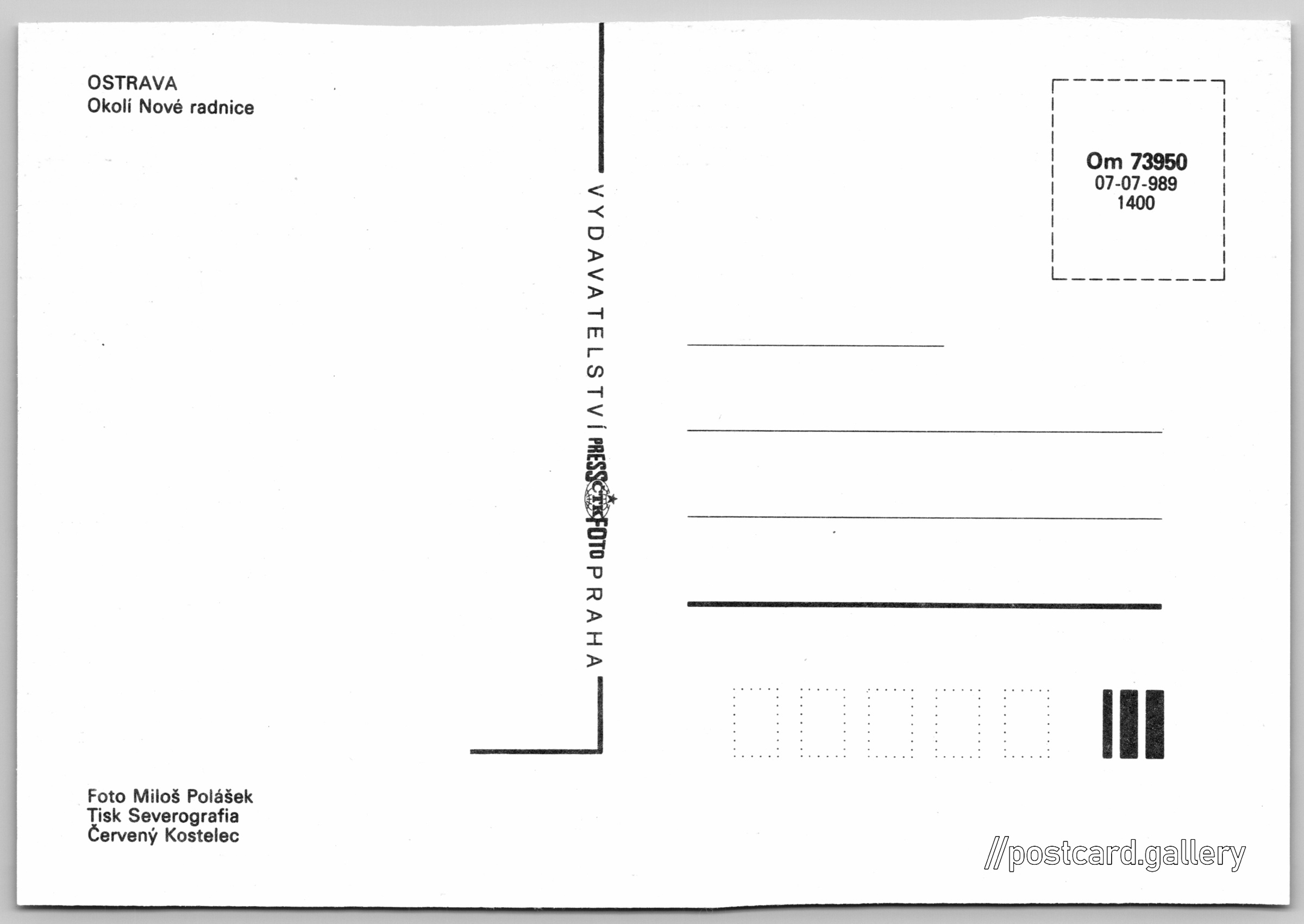 Ostrava, okolí Nové radnice 4/18 Pokud chcete vidět pohlednice ve vyšším rozlišení nebo zobrazovat jejich zadní stranu, tak se prosím nejdříve přihlašte Přihlásit Zaregistrovat OSTRAVAOkolí Nové radnice Jazyk tištěného textu na pohlednici: čeština Prokešovo náměstí 2020/6, Ostrava, 702 00, Ostrava-město ukázat na mapě V blízkém okolí místa zobrazeného na pohlednici lze najít 26 jiných pohlednic. Zobrazit blízké pohlednice Vydavatel: PressFoto Praha (Československo) Rok vydání pohlednice: 1989 Velikost (š x v) a tvar pohlednice: 148 x 102 mm (5.83" x 4.02"), obdélník Osoby spjaté s touto pohlednicí: Miloš Polášek(Autor fotografie) Čistá pohlednice (neprošlá poštou) Kódy na pohlednici: Om 73950 07-07-989 1400 DiskuseVložit příspěvek Přidat novou složku ... Spravovat složky ...