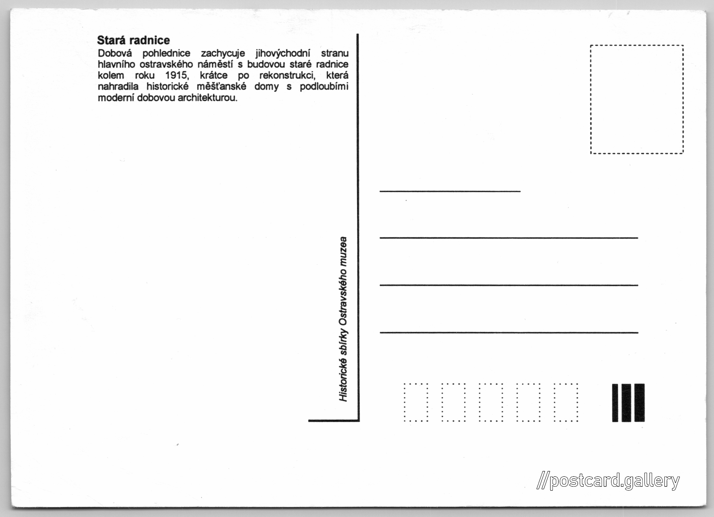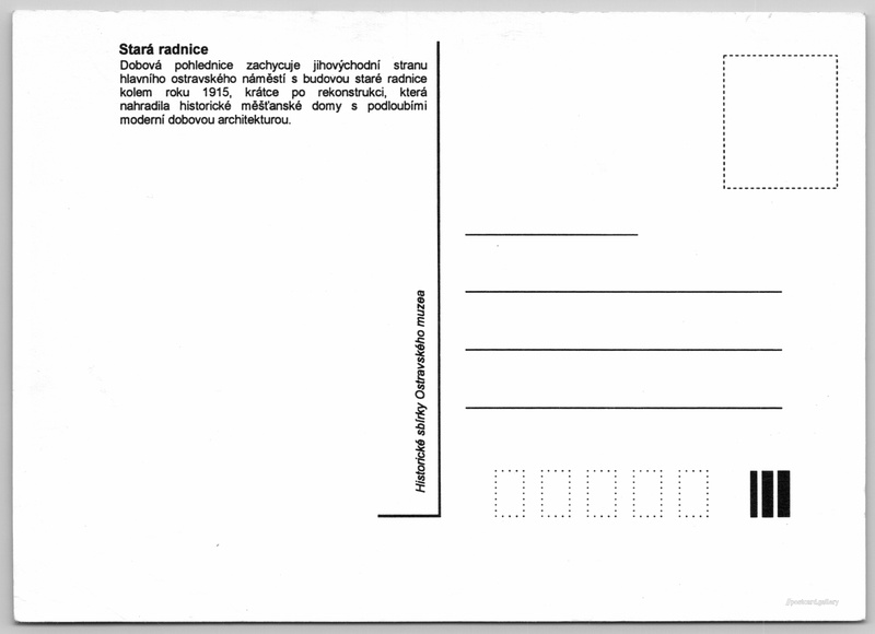 Dobová pohlednice zachycuje jihovýchodní stranu hlavního ostravského náměstí s budovou staré radnice kolem roku 1915, krátce po rekonstrukci, která nahradila historické měšťanské domy s podloubími moderní dobovou architekturou.