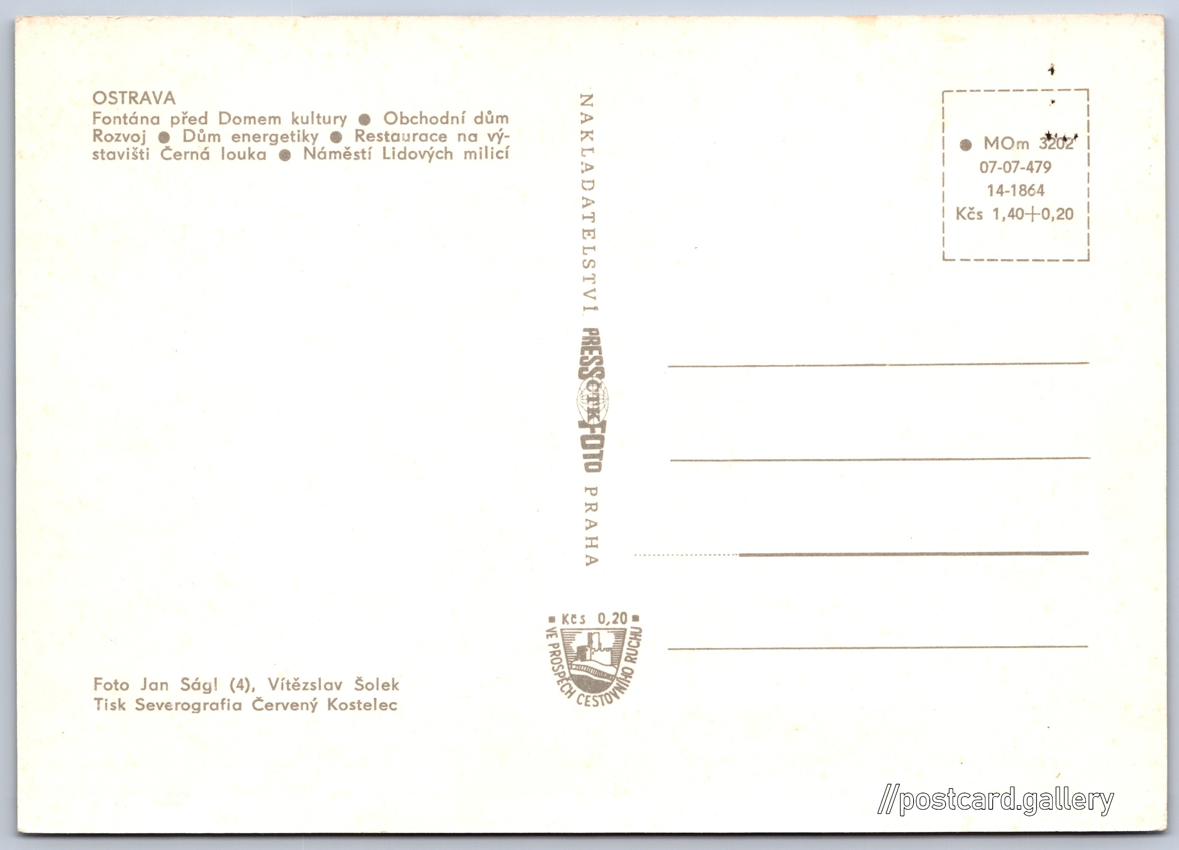Ostrava Pokud chcete vidět pohlednice ve vyšším rozlišení nebo zobrazovat jejich zadní stranu, tak se prosím nejdříve přihlašte Přihlásit Zaregistrovat Ostrava OSTRAVA- Fontána před Domem kultury- Obchodní dům Rozvoj- Dům energetiky- Restaurace na výstavišti Černá louka- Náměstí Lidových milicí Jazyk tištěného textu na pohlednici: čeština 28. října, Ostrava, Ostrava-město ukázat na mapě V blízkém okolí místa zobrazeného na pohlednici lze najít 28 jiných pohlednic. Zobrazit blízké pohlednice Vydavatel: PressFoto Praha (Československo) Rok vydání pohlednice: 1974 Velikost (š x v) a tvar pohlednice: 148 x 105 mm (5.83" x 4.13"), obdélník Osoby spjaté s touto pohlednicí: Jan Ságl(Autor fotografie) Vítězslav Šolek(Autor fotografie) Čistá pohlednice (neprošlá poštou) Ceny: Cena pohlednice: 1,40 Kčs (CSK) (+0,20 Kčs přípl. na tur. ruch) Kódy na pohlednici: MOm 3202 07-07-479 14-1864 DiskuseVložit příspěvek Přidat novou složku ... Spravovat složky ...