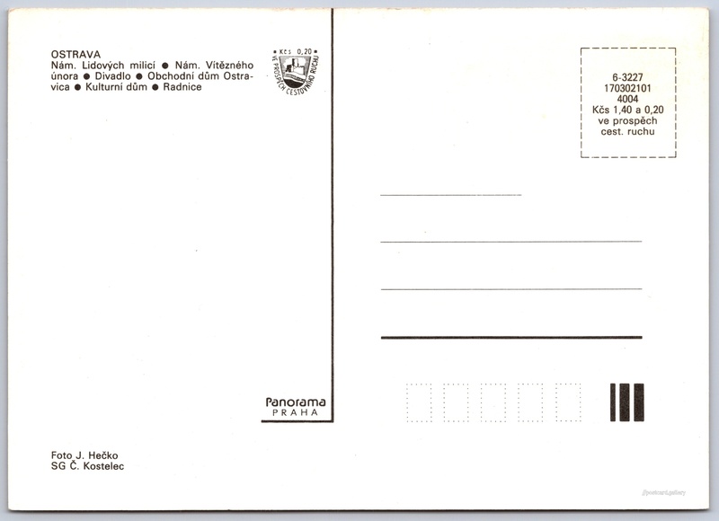 Ostrava 3/26 Pokud chcete vidět pohlednice ve vyšším rozlišení nebo zobrazovat jejich zadní stranu, tak se prosím nejdříve přihlašte Přihlásit Zaregistrovat Ostrava OSTRAVA- Nám. Lidových milicí- Nám. Vítězného února- Divadlo- Obchodní dům Ostravica- Kulturní dům- Radnice Jazyk tištěného textu na pohlednici: čeština 28. října, Ostrava, Ostrava-město ukázat na mapě V blízkém okolí místa zobrazeného na pohlednici lze najít 27 jiných pohlednic. Zobrazit blízké pohlednice Vydavatel: Panorama (Československo) Datum vydání není známo Pomozte nám odhadnout datum vzniku pohlednice Velikost (š x v) a tvar pohlednice: 148 x 106 mm (5.83" x 4.17"), obdélník Osoby spjaté s touto pohlednicí: J. Hečko(Autor fotografie) Čistá pohlednice (neprošlá poštou) Ceny: Cena pohlednice: 1,40 Kčs (CSK) (+0,20 Kčs přípl. na tur. ruch) Kódy na pohlednici: 6-3227 170302101 4004 DiskuseVložit příspěvek Přidat novou složku ... Spravovat složky ...