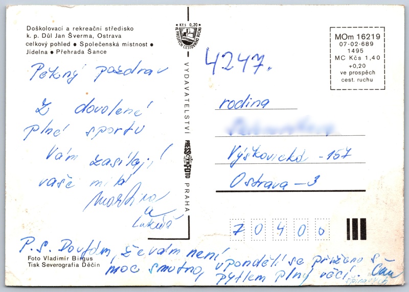 Ostravice, doškolovací a rekreační středisko Pokud chcete vidět pohlednice ve vyšším rozlišení nebo zobrazovat jejich zadní stranu, tak se prosím nejdříve přihlašte Přihlásit Zaregistrovat Důl Šverma OstravaOKROstravice Doškolovací a rekreační střediskok. p. Důl Jan Šverma, Ostrava- celkový pohled- Společenská místnost- Jídelna- Přehrada Šance Jazyk tištěného textu na pohlednici: čeština BELTINE forest hotel, Ostravice ev. č. 386, Ostravice, Česko ukázat na mapě Vydavatel: PressFoto Praha (Československo) Rok vydání pohlednice: 1986 Velikost (š x v) a tvar pohlednice: 147 x 103 mm (5.79" x 4.06"), obdélník Osoby spjaté s touto pohlednicí: Vladimír Birgus(Autor fotografie) Jan Šverma(Obsah pohlednice) Prošlá poštou Ceny: Cena pohlednice: 1,40 Kčs (CSK) (+0,20 Kčs přípl. na tur. ruch) Kódy na pohlednici: MOm 16219 07-02-689 1495 DiskuseVložit příspěvek Přidat novou složku ... Spravovat složky ...
