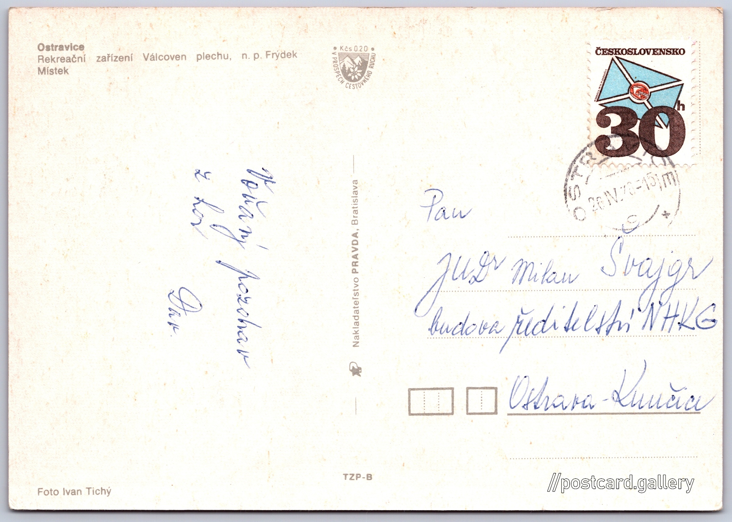 Ostravice, rekreační středisko Válcoven plechu FM Pokud chcete vidět pohlednice ve vyšším rozlišení nebo zobrazovat jejich zadní stranu, tak se prosím nejdříve přihlašte Přihlásit Zaregistrovat OstraviceRekreační zařízení Válcoven plechu, n. p. Frýdek Místek Jazyk tištěného textu na pohlednici: čeština Ostravice ev. č. 1279, Ostravice, 739 14, Frýdek-Místek ukázat na mapě V blízkém okolí místa zobrazeného na pohlednici lze najít 12 jiných pohlednic. Zobrazit blízké pohlednice Vydavatel: Nakladateľstvo PRAVDA, Bratislava (Československo) Odhadované datum vydání pohlednice: 1975 - 1978 Pomozte nám zpřesnit rok vzniku pohlednice Velikost (š x v) a tvar pohlednice: 148 x 104 mm (5.83" x 4.09"), obdélník Osoby spjaté s touto pohlednicí: Ivan Tichý(Autor fotografie) Prošlá poštou:Datum na razítku: 26.4.1978 Ceny: Příplatek na tur. ruch: 0,20 Kčs (CSK))Vyplacené známky: 0,30 Kčs (CSK) DiskuseVložit příspěvek Přidat novou složku ... Spravovat složky ...