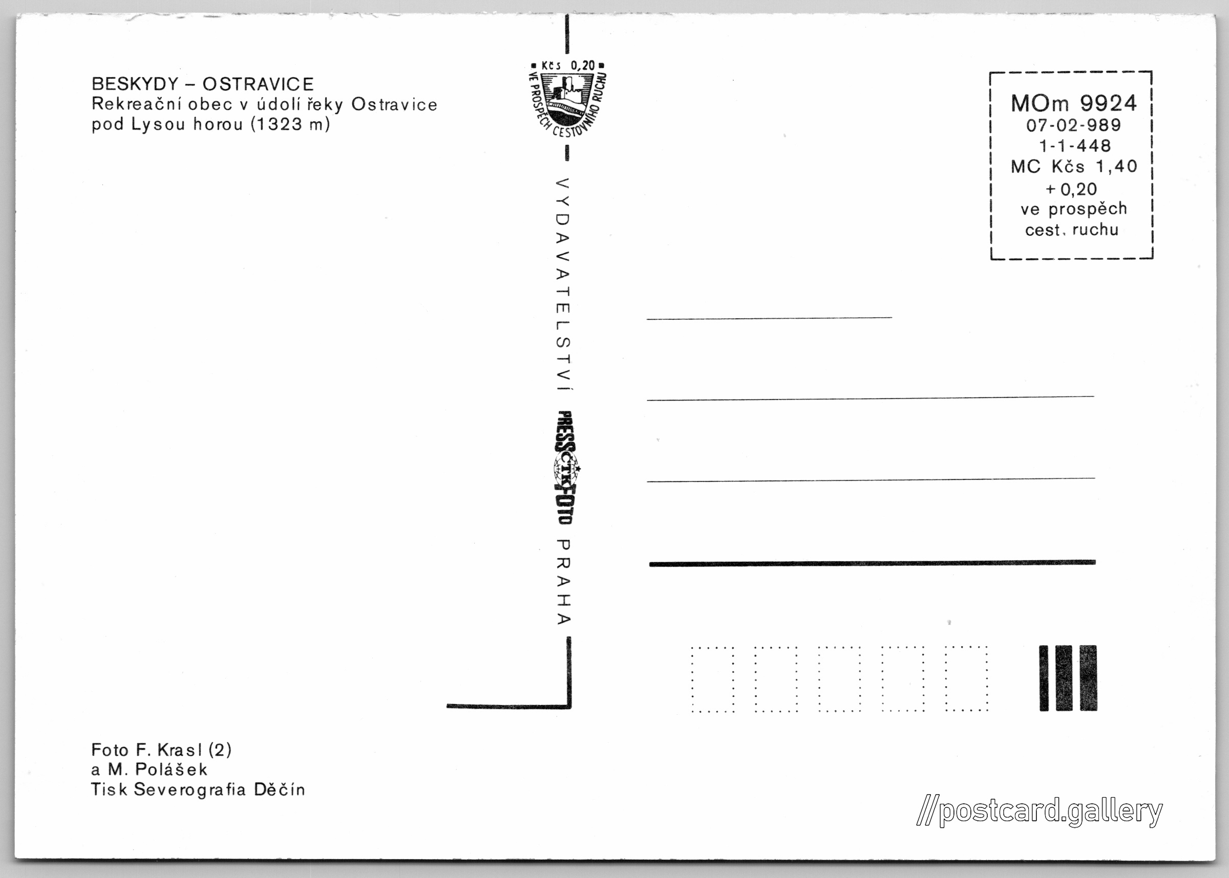 Ostravice Pokud chcete vidět pohlednice ve vyšším rozlišení nebo zobrazovat jejich zadní stranu, tak se prosím nejdříve přihlašte Přihlásit Zaregistrovat Ostravice BESKYDY - OSTRAVICERekreační obec v údolí řeky Ostravice pod Lysou horou (1323 m) Jazyk tištěného textu na pohlednici: čeština Lysá hora (1324 m), Hora, výškový bod, Krásná, Moravskoslezský kraj, Česko ukázat na mapě V blízkém okolí místa zobrazeného na pohlednici lze najít 12 jiných pohlednic. Zobrazit blízké pohlednice Vydavatel: PressFoto Praha (Československo) Rok vydání pohlednice: 1989 Velikost (š x v) a tvar pohlednice: 148 x 104 mm (5.83" x 4.09"), obdélník Osoby spjaté s touto pohlednicí: František Krasl(Autor fotografie) Miloš Polášek(Autor fotografie) Čistá pohlednice (neprošlá poštou) Ceny: Cena pohlednice: 1,40 Kčs (CSK) (+0,20 Kčs přípl. na tur. ruch) Kódy na pohlednici: MOm 9924 07-02-989 1-1-448 DiskuseVložit příspěvek Přidat novou složku ... Spravovat složky ...