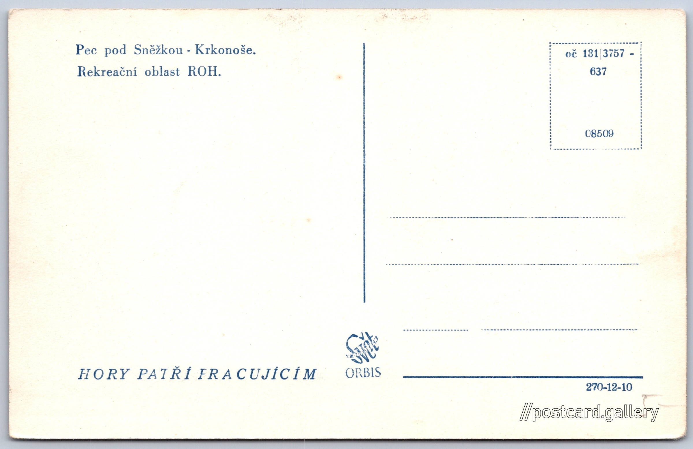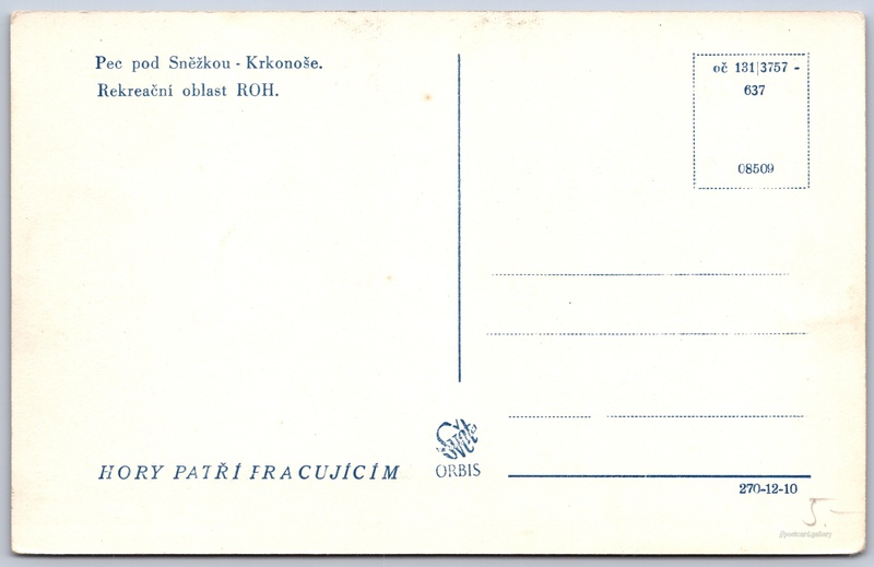 Pec pod Sněžkou, rekreační oblast Pokud chcete vidět pohlednice ve vyšším rozlišení nebo zobrazovat jejich zadní stranu, tak se prosím nejdříve přihlašte Přihlásit Zaregistrovat Pec pod Sněžkou - Krkonoše.Rekreační oblast ROH.HORY PATŘÍ FRACUJÍCÍM ORBIS Jazyk tištěného textu na pohlednici: čeština Pec pod Sněžkou, Trutnov ukázat na mapě V blízkém okolí místa zobrazeného na pohlednici lze najít 41 jiných pohlednic. Zobrazit blízké pohlednice Vydavatel: Nakladatelství Orbis (Československo) Datum vydání není známo Pomozte nám odhadnout datum vzniku pohlednice Velikost (š x v) a tvar pohlednice: 140 x 90 mm (5.51" x 3.54"), obdélník Čistá pohlednice (neprošlá poštou) Kódy na pohlednici: oc 131|3757-637 08509 270-12-10 DiskuseVložit příspěvek Přidat novou složku ... Spravovat složky ...