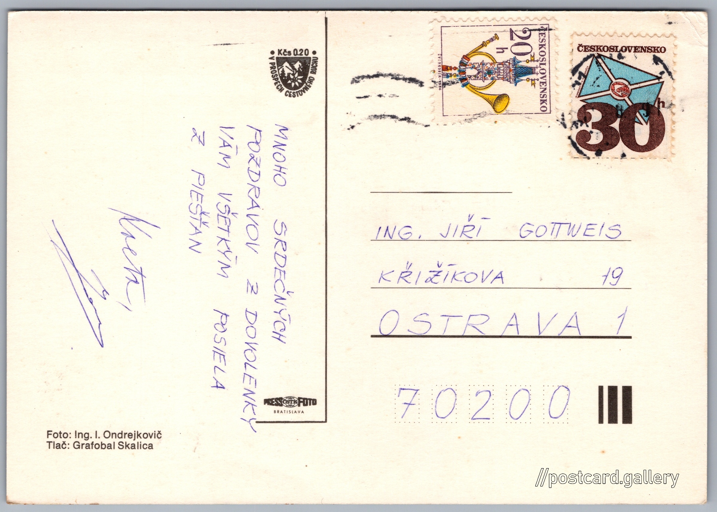 Piešťany, Hotel Slovan Pokud chcete vidět pohlednice ve vyšším rozlišení nebo zobrazovat jejich zadní stranu, tak se prosím nejdříve přihlašte Přihlásit Zaregistrovat Piešťany, Slovan Jazyk tištěného textu na pohlednici: slovenština Grand Hotel Royal, Budova, Sad Andreja Kmeťa 1788/82, Piešťany, Slovensko ukázat na mapě V blízkém okolí místa zobrazeného na pohlednici lze najít 22 jiných pohlednic. Zobrazit blízké pohlednice Vydavatel: PressFoto Bratislava (Československo) Datum vydání není známo Pomozte nám odhadnout datum vzniku pohlednice Velikost (š x v) a tvar pohlednice: 148 x 104 mm (5.83" x 4.09"), obdélník Osoby spjaté s touto pohlednicí: Ivan Ondrejkovič(Autor fotografie) Prošlá poštou Ceny: Příplatek na tur. ruch: 0,20 Kčs (CSK))Vyplacené známky: 0,30 Kčs (CSK) DiskuseVložit příspěvek Přidat novou složku ... Spravovat složky ...
