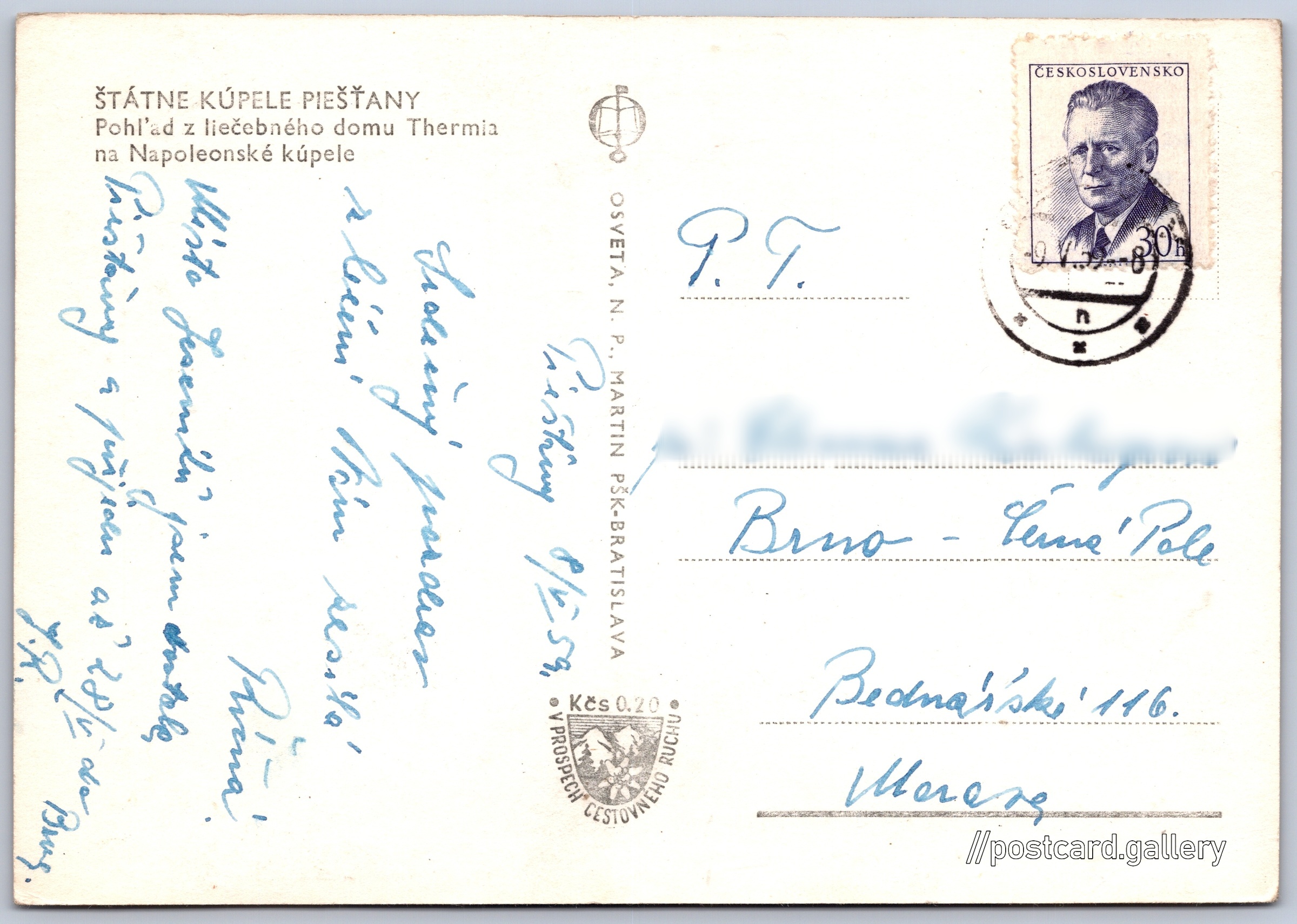 Piešťany, Napoleonské kúpele Pokud chcete vidět pohlednice ve vyšším rozlišení nebo zobrazovat jejich zadní stranu, tak se prosím nejdříve přihlašte Přihlásit Zaregistrovat ŠTÁTNE KÚPELE PIEŠŤANYPohľad z liečebného domu Thermia na Napoleonské kúpele Jazyk tištěného textu na pohlednici: slovenština Kúpeľný ostrov ukázat na mapě V blízkém okolí místa zobrazeného na pohlednici lze najít 22 jiných pohlednic. Zobrazit blízké pohlednice Vydavatel: Osveta, n. p., Martin PŠK - Bratislava (Československo) Odhadované datum vydání pohlednice: 1956 - 1959 Pomozte nám zpřesnit rok vzniku pohlednice Velikost (š x v) a tvar pohlednice: 147 x 104 mm (5.79" x 4.09"), obdélník Prošlá poštou:Datum na razítku: 9.5.1959Datum napsání pohledu: 8.5.1959 Ceny: Příplatek na tur. ruch: 0,20 Kčs (CSK))Vyplacené známky: 0,30 Kčs (CSK) DiskuseVložit příspěvek Přidat novou složku ... Spravovat složky ...