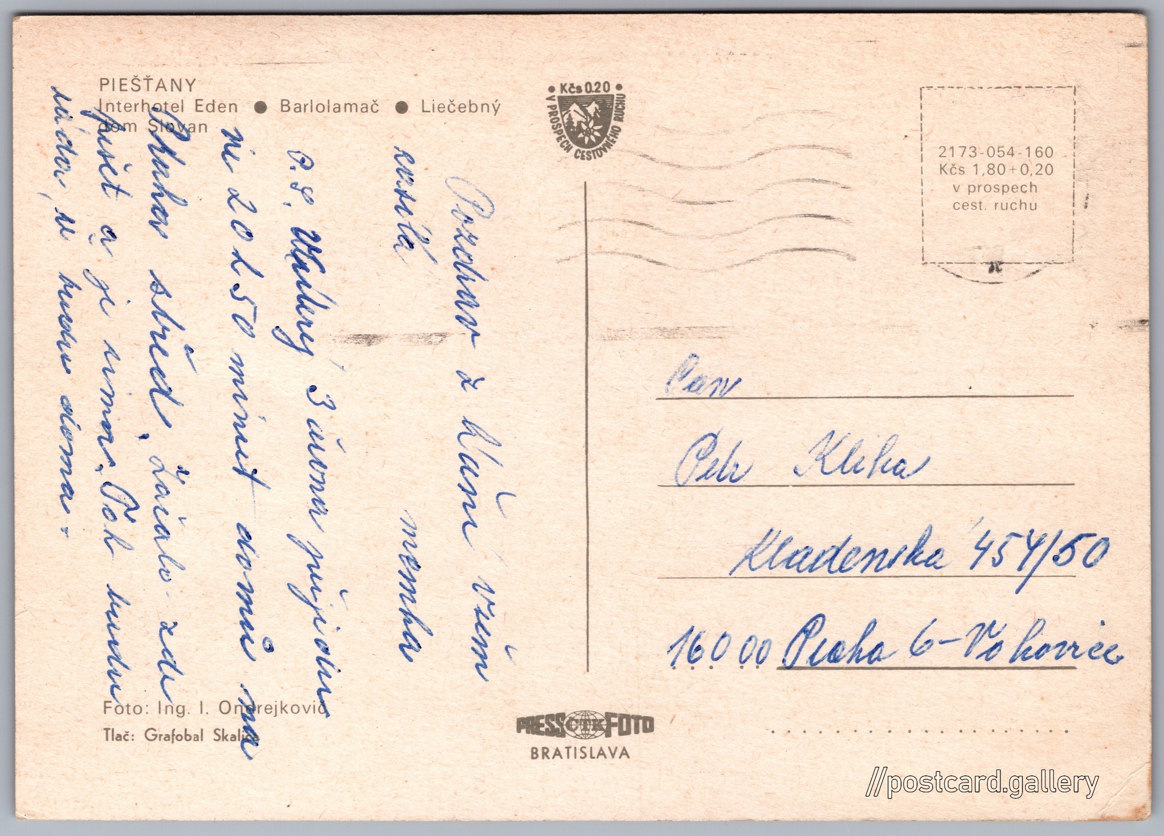 Piešťany Pokud chcete vidět pohlednice ve vyšším rozlišení nebo zobrazovat jejich zadní stranu, tak se prosím nejdříve přihlašte Přihlásit Zaregistrovat Piešťany PIEŠŤANY- Interhotel Eden- Barlolamač- Ličebny dom Slovan Jazyk tištěného textu na pohlednici: slovenština The Crutchbreaker, Socha, Piešťany, Slovensko ukázat na mapě V blízkém okolí místa zobrazeného na pohlednici lze najít 22 jiných pohlednic. Zobrazit blízké pohlednice Vydavatel: PressFoto Bratislava (Československo) Datum vydání není známo Pomozte nám odhadnout datum vzniku pohlednice Velikost (š x v) a tvar pohlednice: 148 x 105 mm (5.83" x 4.13"), obdélník Osoby spjaté s touto pohlednicí: Ivan Ondrejkovič(Autor fotografie) Prošlá poštou Ceny: Cena pohlednice: 1,80 Kčs (CSK) (+0,20 Kčs přípl. na tur. ruch) Kódy na pohlednici: 2173-054-160 DiskuseVložit příspěvek Přidat novou složku ... Spravovat složky ...