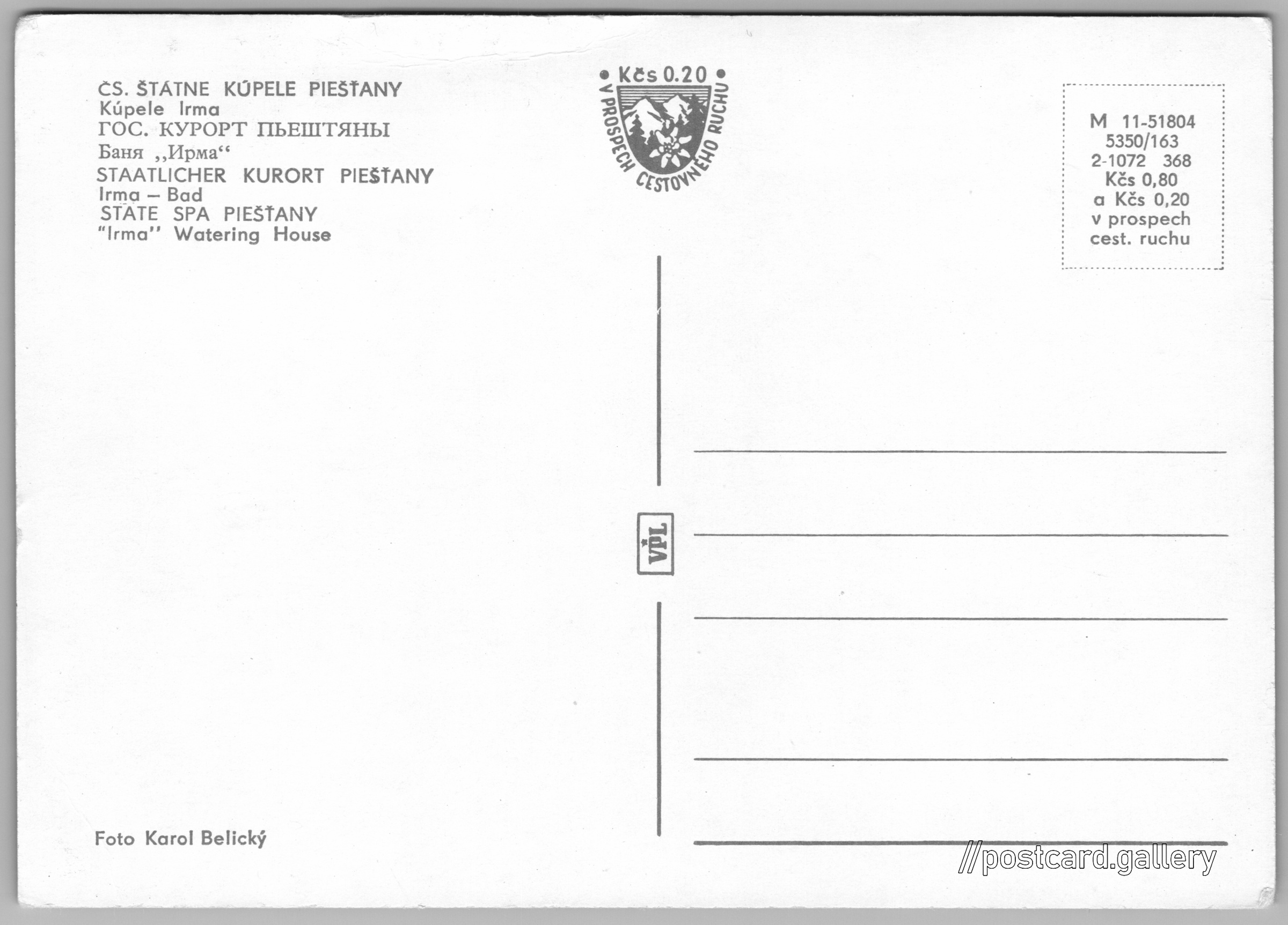 Piešťany Pokud chcete vidět pohlednice ve vyšším rozlišení nebo zobrazovat jejich zadní stranu, tak se prosím nejdříve přihlašte Přihlásit Zaregistrovat ČS. ŠTÁTNE KÚPELE PIEŠŤANYKúpele IrmaГОС. КУРОРТ ПЬЕШТЯНЫБаня ,,Ирма"STAATLICHER KURORT PIEŠŤANYIrma - BadSTATE SPA PIEŠŤANY"Irma" Watering House Jazyk tištěného textu na pohlednici: slovenština Irma, Budova, Nábrežie Justusa Jána Torkosa 3591/4, Piešťany, Slovensko ukázat na mapě V blízkém okolí místa zobrazeného na pohlednici lze najít 22 jiných pohlednic. Zobrazit blízké pohlednice Vydavatel: VPL (Československo) Datum vydání není známo Pomozte nám odhadnout datum vzniku pohlednice Velikost (š x v) a tvar pohlednice: 149 x 106 mm (5.87" x 4.17"), obdélník Osoby spjaté s touto pohlednicí: Karol Belický(Autor fotografie) Čistá pohlednice (neprošlá poštou) Ceny: Cena pohlednice: 0,80 Kčs (CSK) (+0,20 Kčs přípl. na tur. ruch) Kódy na pohlednici: M 11-51804 5350/163 2-1072 368 DiskuseVložit příspěvek Přidat novou složku ... Spravovat složky ...