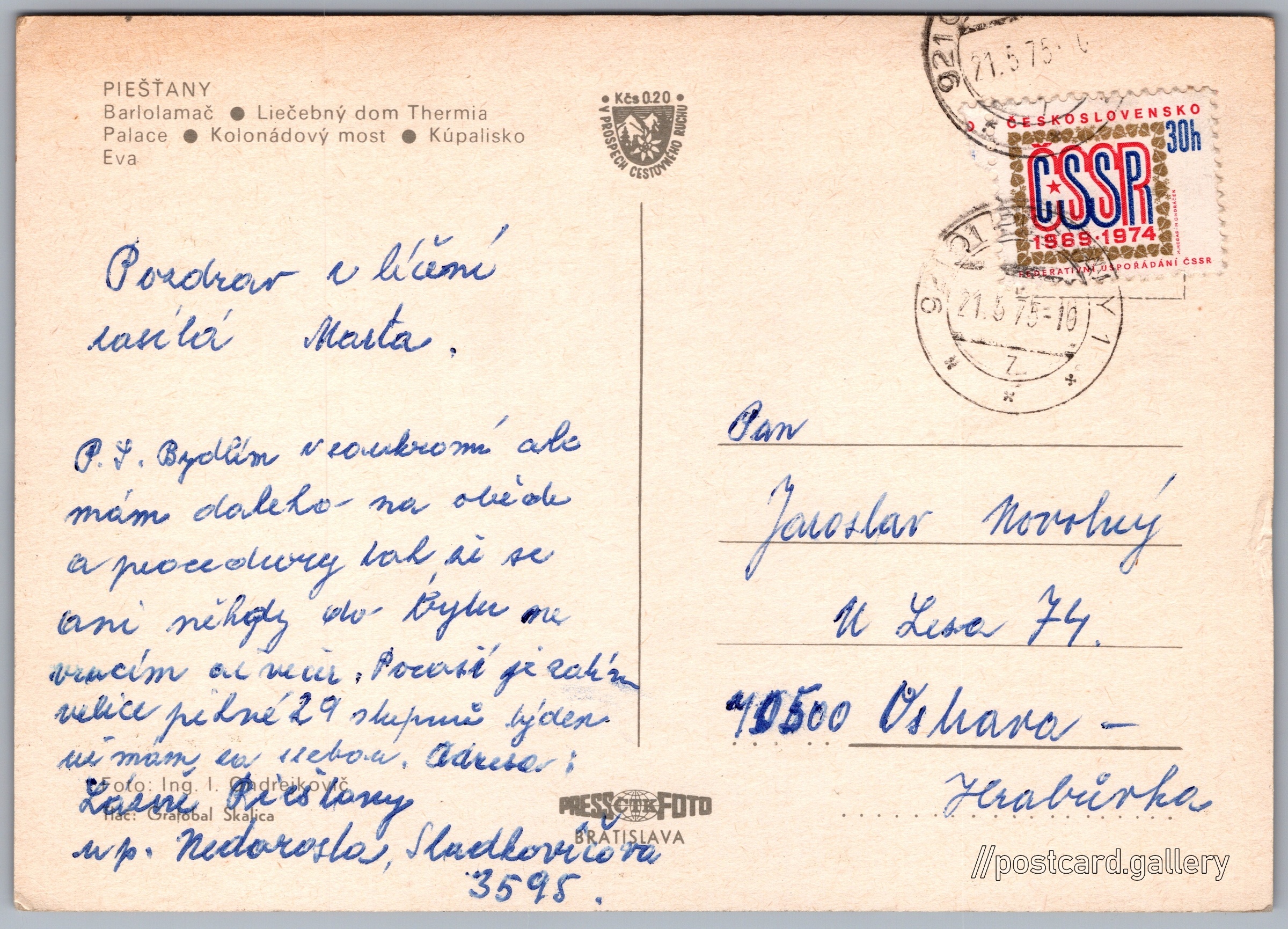 Piešťany Pokud chcete vidět pohlednice ve vyšším rozlišení nebo zobrazovat jejich zadní stranu, tak se prosím nejdříve přihlašte Přihlásit Zaregistrovat Piešťany PIEŠŤANY- Barlolamač- Liečebný dom Thermia Palace- Kolonádový most- Kúpalisko Jazyk tištěného textu na pohlednici: čeština Piešťany, Kolonád. most, Cykloturistický rozcestník, Piešťany, Slovensko ukázat na mapě V blízkém okolí místa zobrazeného na pohlednici lze najít 22 jiných pohlednic. Zobrazit blízké pohlednice Vydavatel: PressFoto Bratislava (Československo) Odhadované datum vydání pohlednice: 1972 - 1975 Pomozte nám zpřesnit rok vzniku pohlednice Velikost (š x v) a tvar pohlednice: 148 x 105 mm (5.83" x 4.13"), obdélník Osoby spjaté s touto pohlednicí: Ivan Ondrejkovič(Autor fotografie) Prošlá poštou:Datum na razítku: 21.5.1975 Ceny: Příplatek na tur. ruch: 0,20 Kčs (CSK))Vyplacené známky: 0,30 Kčs (CSK) DiskuseVložit příspěvek Přidat novou složku ... Spravovat složky ...