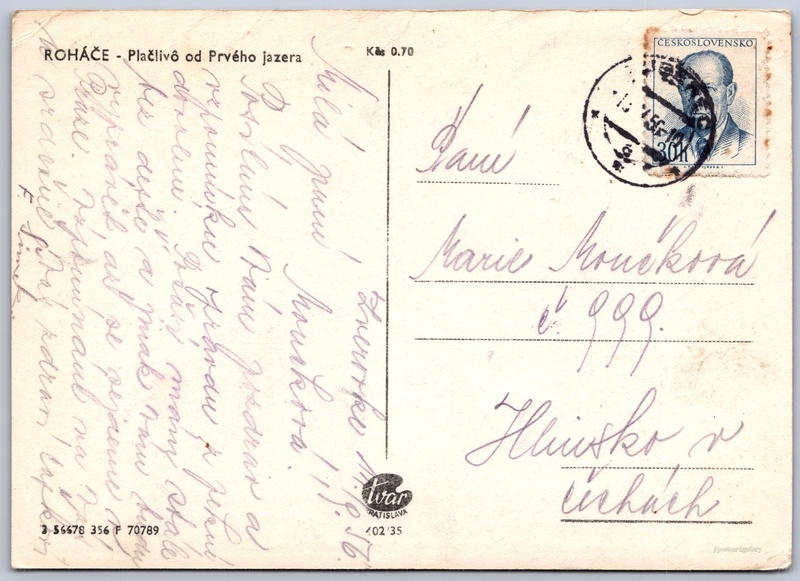 Plačlivé 1/13 Pokud chcete vidět pohlednice ve vyšším rozlišení nebo zobrazovat jejich zadní stranu, tak se prosím nejdříve přihlašte Přihlásit Zaregistrovat ROHÁČE - Plačlivô od Prvého jazera Jazyk tištěného textu na pohlednici: slovenština Plačlivé (2125 m), Hora, výškový bod, Žiar, Okres Liptovský Mikuláš, Žilinský kraj, Slovensko ukázat na mapě V blízkém okolí místa zobrazeného na pohlednici lze najít 13 jiných pohlednic. Zobrazit blízké pohlednice Vydavatel: Tvar Bratislava (Československo) Rok vydání pohlednice: březen, 1956 Velikost (š x v) a tvar pohlednice: 145 x 104 mm (5.71" x 4.09"), obdélník Prošlá poštou:Datum napsání pohledu: 11.9.1956 Ceny: Cena pohlednice: 0,70 Kčs (CSK)Vyplacené známky: 0,30 Kčs (CSK) Kódy na pohlednici: 3 56678 356 F 70789 402/35 DiskuseVložit příspěvek Přidat novou složku ... Spravovat složky ...