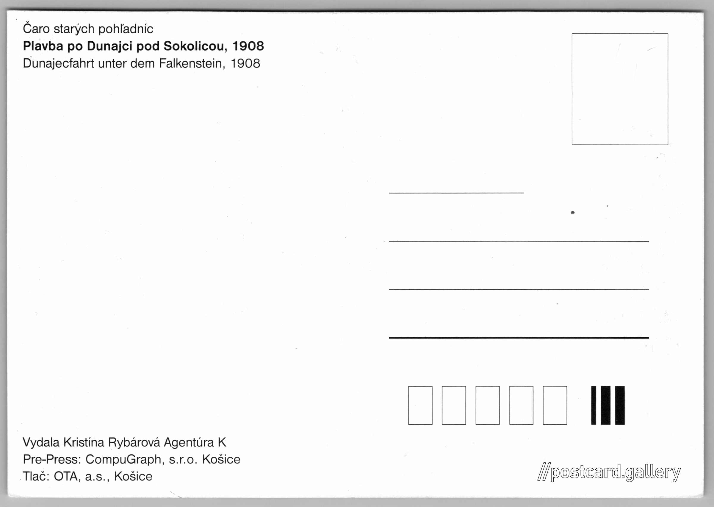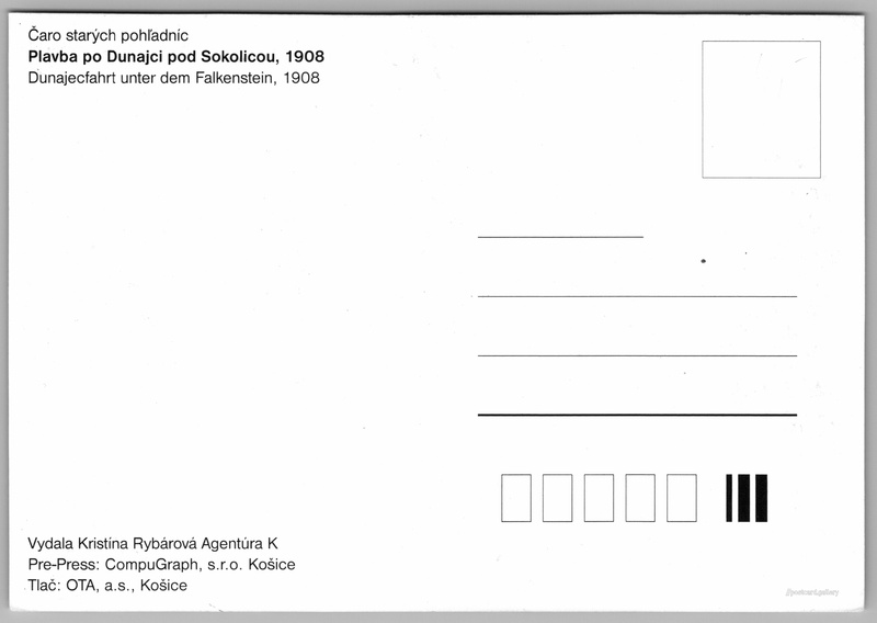 Plavba po Dunajci Pokud chcete vidět pohlednice ve vyšším rozlišení nebo zobrazovat jejich zadní stranu, tak se prosím nejdříve přihlašte Přihlásit Zaregistrovat Čaro starých pohľadnícPlavba po Dunajci pod Sokolicou, 1908Dunajecfahrt unter dem Falkenstein, 1908 Jazyk tištěného textu na pohlednici: slovenština Dunajec vodácký, Úsek řeky pro vodní turistiku, Červený Kláštor, Slovensko ukázat na mapě V blízkém okolí místa zobrazeného na pohlednici lze najít 7 jiných pohlednic. Zobrazit blízké pohlednice Vydavatel: Kristína Rybárová Agentúra K (Slovensko) Datum vydání není známo Pomozte nám odhadnout datum vzniku pohlednice Velikost (š x v) a tvar pohlednice: 144 x 101 mm (5.67" x 3.98"), obdélník Čistá pohlednice (neprošlá poštou) DiskuseVložit příspěvek Přidat novou složku ... Spravovat složky ...