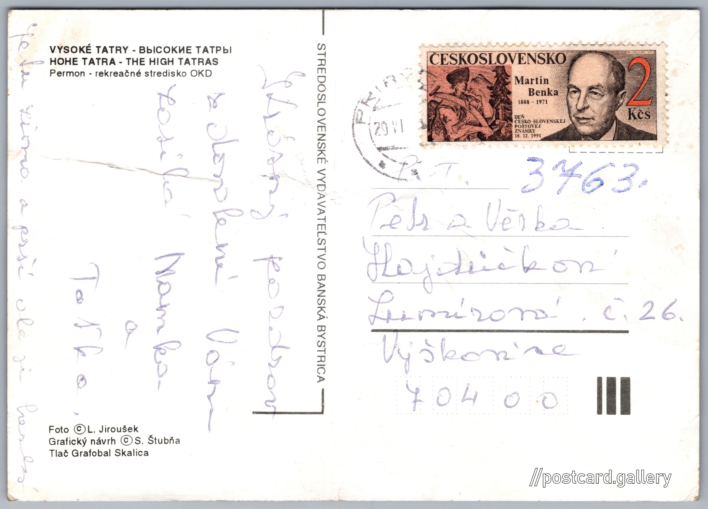 Podbanské, Permon Pokud chcete vidět pohlednice ve vyšším rozlišení nebo zobrazovat jejich zadní stranu, tak se prosím nejdříve přihlašte Přihlásit Zaregistrovat Podbanské VYSOKÉ TATRY - ВЫСОКИЕ ТАТРЫHOHE TATRA - THE HIGH TATRASPermon - rekreačné stredisko OKD Jazyk tištěného textu na pohlednici: slovenština Grand hotel Permon, Pribylina 1486, Pribylina, Slovensko ukázat na mapě V blízkém okolí místa zobrazeného na pohlednici lze najít 7 jiných pohlednic. Zobrazit blízké pohlednice Vydavatel: Stredoslovenské vydavateľstvo Banská Bystrica (Slovensko) Odhadované datum vydání pohlednice: 1988 - 1991 Pomozte nám zpřesnit rok vzniku pohlednice Velikost (š x v) a tvar pohlednice: 148 x 104 mm (5.83" x 4.09"), obdélník Osoby spjaté s touto pohlednicí: S. Štubňa(Design pohlednice) Ladislav Jiroušek(Autor fotografie) Prošlá poštou Ceny: Vyplacené známky: 2,00 Kčs (CSK) DiskuseVložit příspěvek Přidat novou složku ... Spravovat složky ...