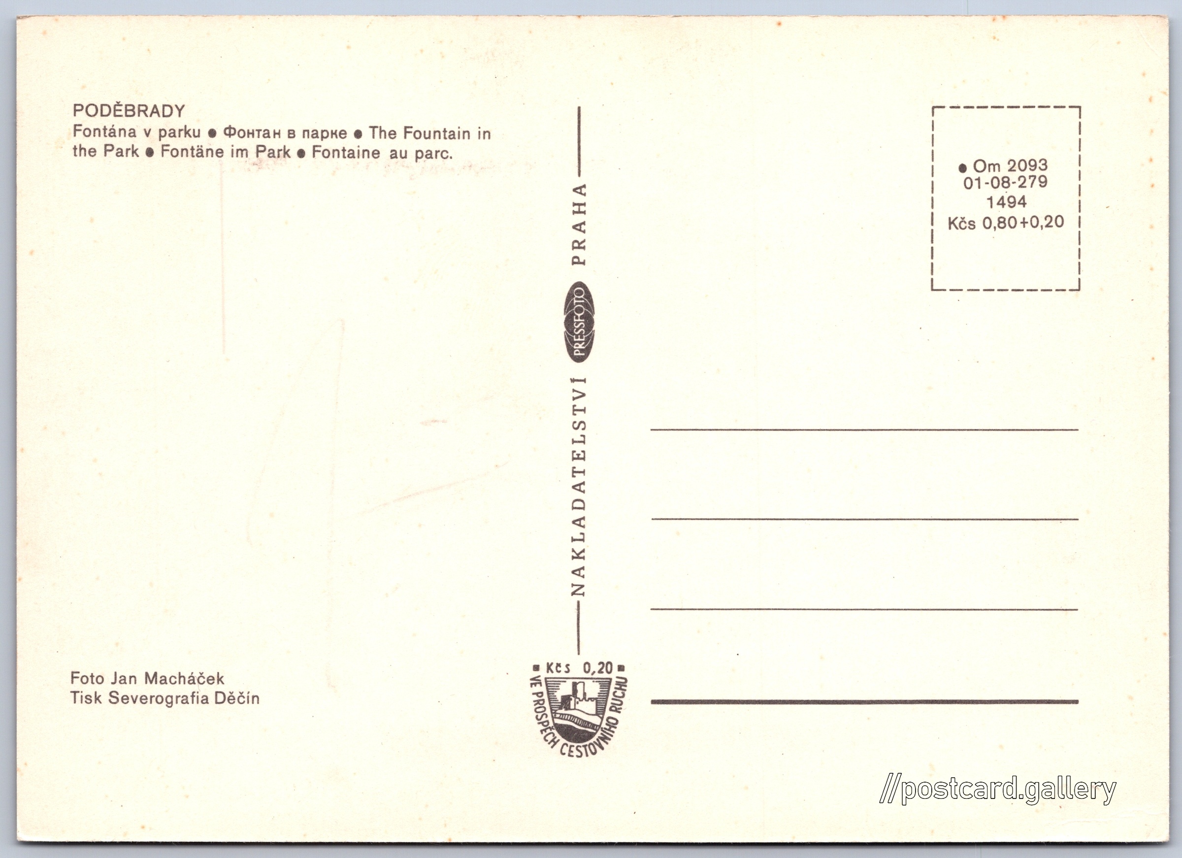 Poděbrady, fontána v parku Pokud chcete vidět pohlednice ve vyšším rozlišení nebo zobrazovat jejich zadní stranu, tak se prosím nejdříve přihlašte Přihlásit Zaregistrovat PODĚBRADY- Fontána v parku- Фонтан в парке- The Fountain in the Park- Fontäne im Park- Fontaine au parc Jazyky tištěného textu na pohlednici: čeština, ruština, angličtina, francouzština Poděbrady III, Poděbrady, Nymburk ukázat na mapě V blízkém okolí místa zobrazeného na pohlednici lze najít 14 jiných pohlednic. Zobrazit blízké pohlednice Vydavatel: PressFoto Praha (Československo) Rok vydání pohlednice: 1972 Velikost (š x v) a tvar pohlednice: 146 x 104 mm (5.75" x 4.09"), obdélník Osoby spjaté s touto pohlednicí: Jan Macháček(Autor fotografie) Čistá pohlednice (neprošlá poštou) Ceny: Cena pohlednice: 0,80 Kčs (CSK) (+0,20 Kčs přípl. na tur. ruch) Kódy na pohlednici: •Om 2093 01-08-279 1494 DiskuseVložit příspěvek Přidat novou složku ... Spravovat složky ...