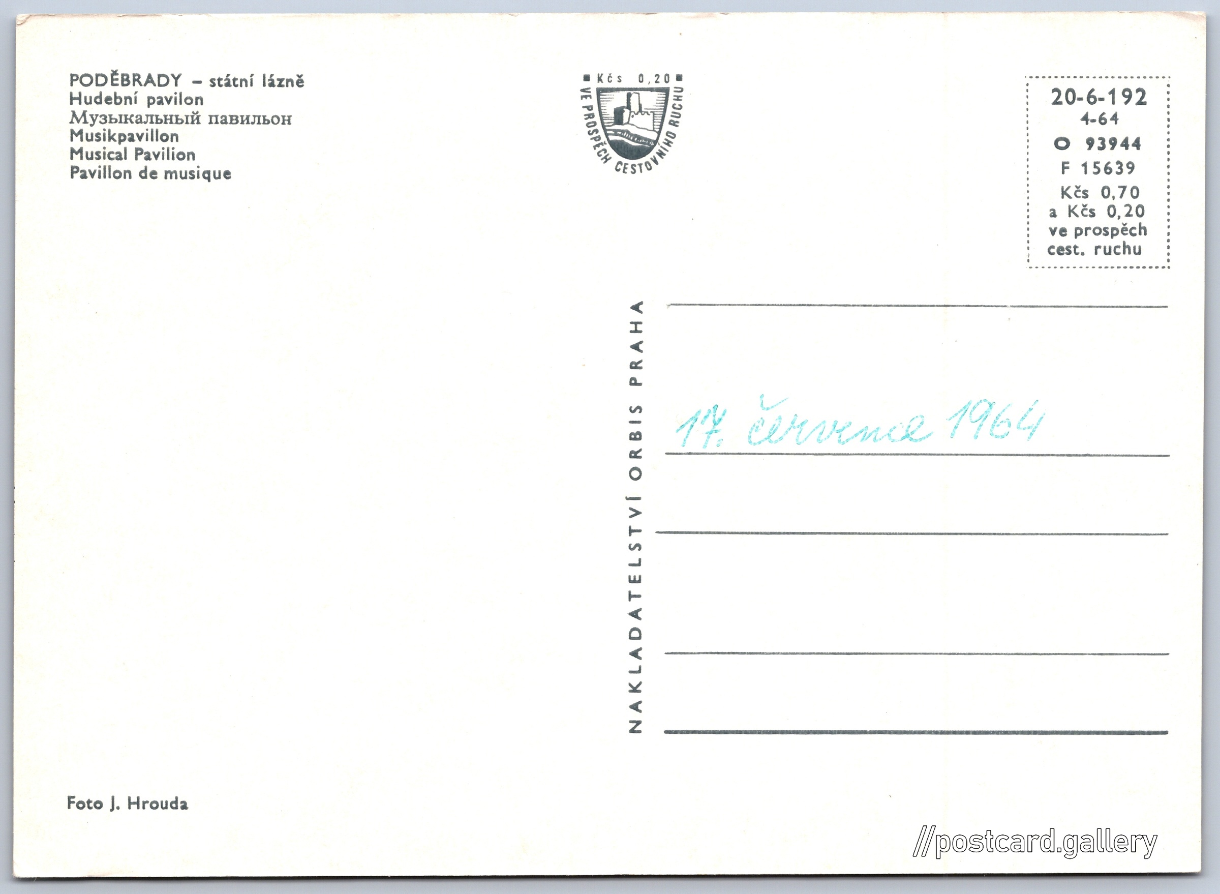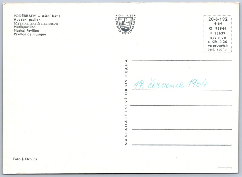 Poděbrady, hudební pavilon Pokud chcete vidět pohlednice ve vyšším rozlišení nebo zobrazovat jejich zadní stranu, tak se prosím nejdříve přihlašte Přihlásit Zaregistrovat PODĚBRADY - státní lázně- Hudební pavilon- Музыкальный павильон- Musikpavillon- Musical Pavilion- Pavillon de musique Jazyky tištěného textu na pohlednici: čeština, ruština, němčina, angličtina, francouzština, francouzština Poděbrady II, Poděbrady, Nymburk ukázat na mapě Vydavatel: Nakladatelství Orbis (Československo) Rok vydání pohlednice: duben, 1964 Velikost (š x v) a tvar pohlednice: 147 x 106 mm (5.79" x 4.17"), obdélník Osoby spjaté s touto pohlednicí: J. Hrouda(Autor fotografie) Čistá pohlednice (neprošlá poštou) Ceny: Cena pohlednice: 0,70 Kčs (CSK) (+0,20 Kčs přípl. na tur. ruch) Kódy na pohlednici: 20-6-192 4-64 O 93944 F 15639 DiskuseVložit příspěvek Přidat novou složku ... Spravovat složky ...