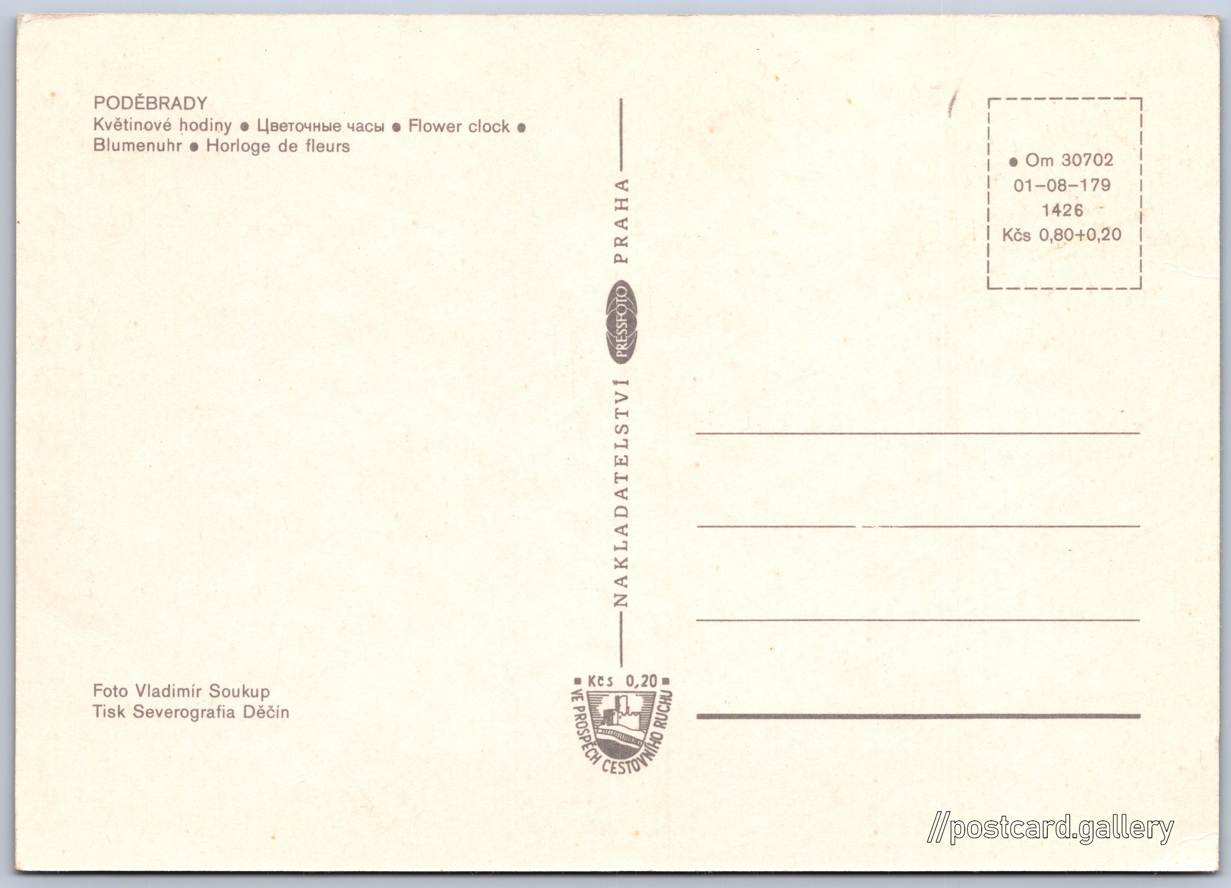 Poděbrady, květinové hodiny Pokud chcete vidět pohlednice ve vyšším rozlišení nebo zobrazovat jejich zadní stranu, tak se prosím nejdříve přihlašte Přihlásit Zaregistrovat PODĚBRADY- Květinové hodiny- Цветочные часы- Flower clock- Blumenuhr- Horloge de fleurs Jazyky tištěného textu na pohlednici: čeština, ruština, angličtina, němčina, francouzština, francouzština Květinové hodiny, Jiná zajímavost , nám. T.G.Masaryka, Poděbrady, Česko ukázat na mapě V blízkém okolí místa zobrazeného na pohlednici lze najít 14 jiných pohlednic. Zobrazit blízké pohlednice Vydavatel: PressFoto Praha (Československo) Rok vydání pohlednice: 1971 Velikost (š x v) a tvar pohlednice: 148 x 105 mm (5.83" x 4.13"), obdélník Osoby spjaté s touto pohlednicí: Vladimír Soukup(Autor fotografie) Čistá pohlednice (neprošlá poštou) Ceny: Cena pohlednice: 0,80 Kčs (CSK) (+0,20 Kčs přípl. na tur. ruch) Kódy na pohlednici: •Om 30702 01-08-179 1426 DiskuseVložit příspěvek Přidat novou složku ... Spravovat složky ...