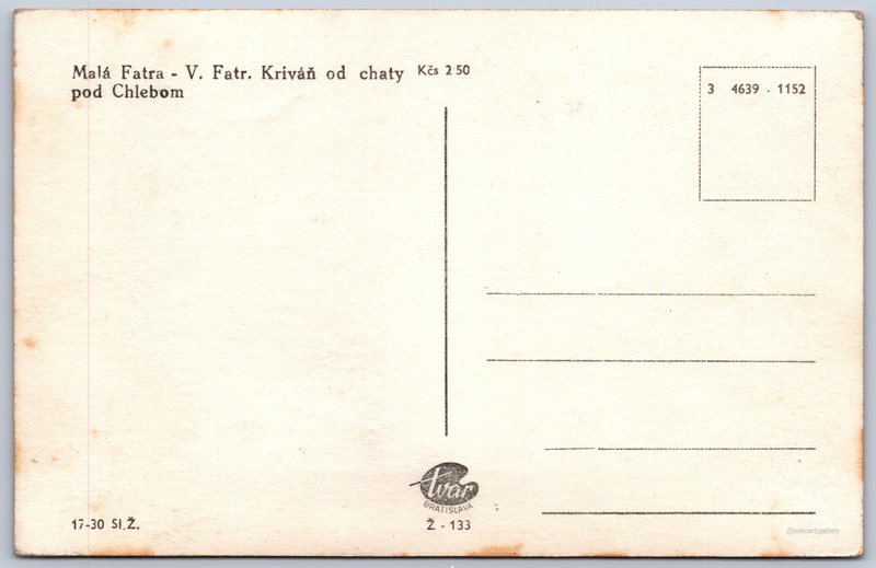 Pohled na Kriváň na Velké Fatře od chaty pod Chlebem Pokud chcete vidět pohlednice ve vyšším rozlišení nebo zobrazovat jejich zadní stranu, tak se prosím nejdříve přihlašte Přihlásit Zaregistrovat Malá Fatra - V. Fatr. Kriváň od chaty pod Chlebom Jazyk tištěného textu na pohlednici: slovenština Velký Kriváň (1708 m), Hora, výškový bod, Turany, Slovensko ukázat na mapě V blízkém okolí místa zobrazeného na pohlednici lze najít 15 jiných pohlednic. Zobrazit blízké pohlednice Vydavatel: Tvar Bratislava (Československo) Rok vydání pohlednice: listopad, 1952 Velikost (š x v) a tvar pohlednice: 138 x 89 mm (5.43" x 3.50"), obdélník Čistá pohlednice (neprošlá poštou) Ceny: Cena pohlednice: 2,50 Kčs (CSK) Kódy na pohlednici: 3 4639 1152 Ž-133 17-30 Sl.Ž. DiskuseVložit příspěvek Přidat novou složku ... Spravovat složky ...