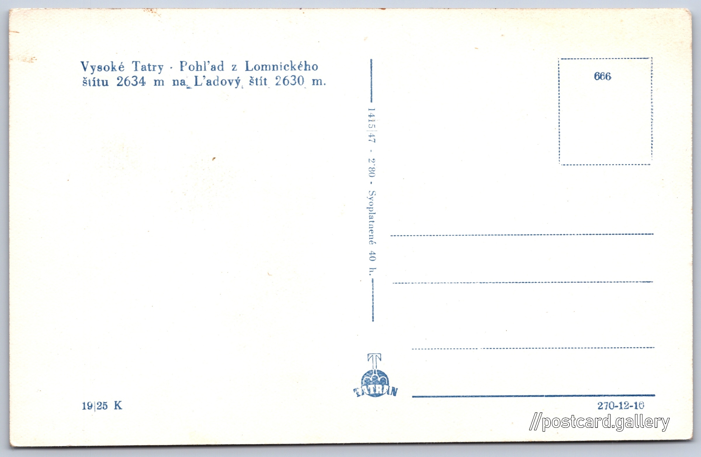 Pohled z Lomnického štítu na Ľadový štít Pokud chcete vidět pohlednice ve vyšším rozlišení nebo zobrazovat jejich zadní stranu, tak se prosím nejdříve přihlašte Přihlásit Zaregistrovat Vysoké Tatry - Pohl'ad z Lomnického štítu 2634 m na Ľadový štít 2630 m. Jazyk tištěného textu na pohlednici: slovenština Ľadový štít (2627 m), Hora, výškový bod, Tatranská Javorina, Slovensko ukázat na mapě V blízkém okolí místa zobrazeného na pohlednici lze najít 138 jiných pohlednic. Zobrazit blízké pohlednice Vydavatel: Tatran (Československo) Rok vydání pohlednice: 1947 Velikost (š x v) a tvar pohlednice: 140 x 89 mm (5.51" x 3.50"), obdélník Čistá pohlednice (neprošlá poštou) Ceny: Cena pohlednice: 2,80 Kčs (CSK) (+0,40 Kčs přípl. na tur. ruch) Kódy na pohlednici: 19|25 K 1415|47 666 270-12-10 DiskuseVložit příspěvek Přidat novou složku ... Spravovat složky ...