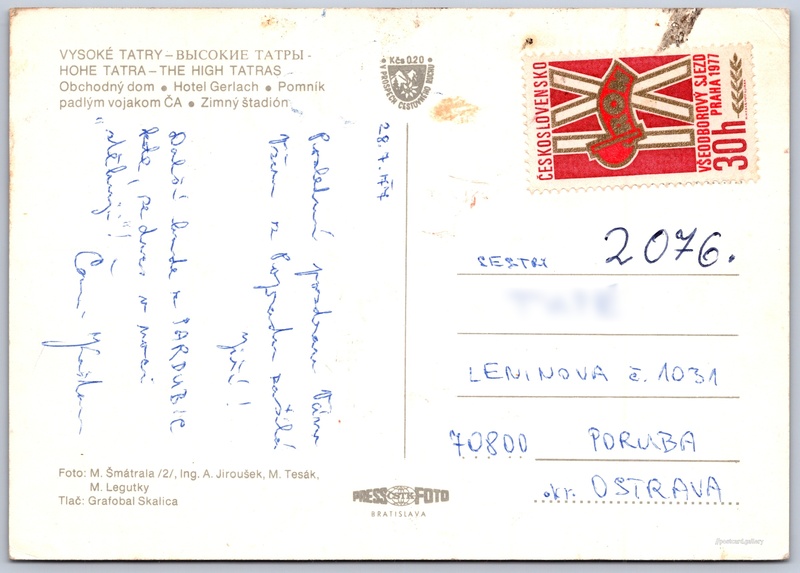 Poprad Pokud chcete vidět pohlednice ve vyšším rozlišení nebo zobrazovat jejich zadní stranu, tak se prosím nejdříve přihlašte Přihlásit Zaregistrovat Poprad VYSOKÉ TATRY - ВЫСОКИЕ ТАТРЫ - HOHE TATRA - THE HIGH TATRAS- Obchodný dom- Hotel Gerlach- Pomník padlým vojakom ČA- Zimný štadión Jazyky tištěného textu na pohlednici: čeština, ruština, němčina, angličtina Poprad ukázat na mapě Vydavatel: PressFoto Bratislava (Československo) Odhadované datum vydání pohlednice: 1974 - 1977 Pomozte nám zpřesnit rok vzniku pohlednice Velikost (š x v) a tvar pohlednice: 148 x 105 mm (5.83" x 4.13"), obdélník Osoby spjaté s touto pohlednicí: Alexander Jiroušek(Autor fotografie) Milan Šmátrala(Autor fotografie) Milan Tesák(Autor fotografie) M. Legutky(Autor fotografie) Prošlá poštou:Datum napsání pohledu: 28.7.1977 Ceny: Příplatek na tur. ruch: 0,20 Kčs (CSK))Vyplacené známky: 0,30 Kčs (CSK) DiskuseVložit příspěvek Přidat novou složku ... Spravovat složky ...