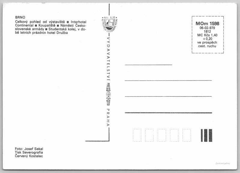 Pozdrav z Brna Pokud chcete vidět pohlednice ve vyšším rozlišení nebo zobrazovat jejich zadní stranu, tak se prosím nejdříve přihlašte Přihlásit Zaregistrovat Pozdrav z Brna BRNO- Celkový pohled od výstaviště- Interhotel Continental- Koupaliště- Náměstí Československé armády- Studentská kolej, v době letních prázdnin hotel Družba Jazyk tištěného textu na pohlednici: čeština Mendlovo náměstí, Brno, Brno-město ukázat na mapě V blízkém okolí místa zobrazeného na pohlednici lze najít 39 jiných pohlednic. Zobrazit blízké pohlednice Vydavatel: PressFoto Praha (Československo) Rok vydání pohlednice: 1979 Velikost (š x v) a tvar pohlednice: 148 x 105 mm (5.83" x 4.13"), obdélník Osoby spjaté s touto pohlednicí: Josef Sekal(Autor fotografie) Čistá pohlednice (neprošlá poštou) Ceny: Cena pohlednice: 1,40 Kčs (CSK) (+0,20 Kčs přípl. na tur. ruch) Kódy na pohlednici: MOm 1598 06-02-979 1812 DiskuseVložit příspěvek Přidat novou složku ... Spravovat složky ...