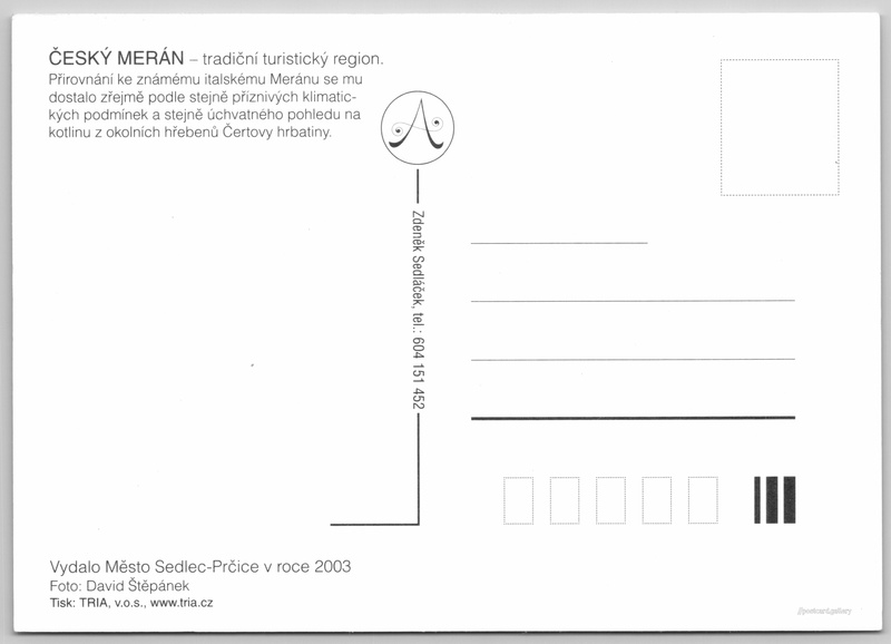 Pozdrav z Českého Meránu Pokud chcete vidět pohlednice ve vyšším rozlišení nebo zobrazovat jejich zadní stranu, tak se prosím nejdříve přihlašte Přihlásit Zaregistrovat Pozdrav z Českého Meránu ČESKÝ MERÁN - tradiční turistický region.Přirovnání ke známému italskému Meránu se mu dostalo zřejmě podle stejně příznivých klimatických podmínek a stejně úchvatného pohledu na kotlinu z okolních hřebenů Čertovy hrbatiny. Jazyk tištěného textu na pohlednici: čeština Sedlec-Prčice, Město, Česko ukázat na mapě Vydavatel: Město Sedlec-Prčice (Česko) Rok vydání pohlednice: 2003 Velikost (š x v) a tvar pohlednice: 148 x 105 mm (5.83" x 4.13"), obdélník Osoby spjaté s touto pohlednicí: David Štěpánek(Autor fotografie) Čistá pohlednice (neprošlá poštou) DiskuseVložit příspěvek Přidat novou složku ... Spravovat složky ...