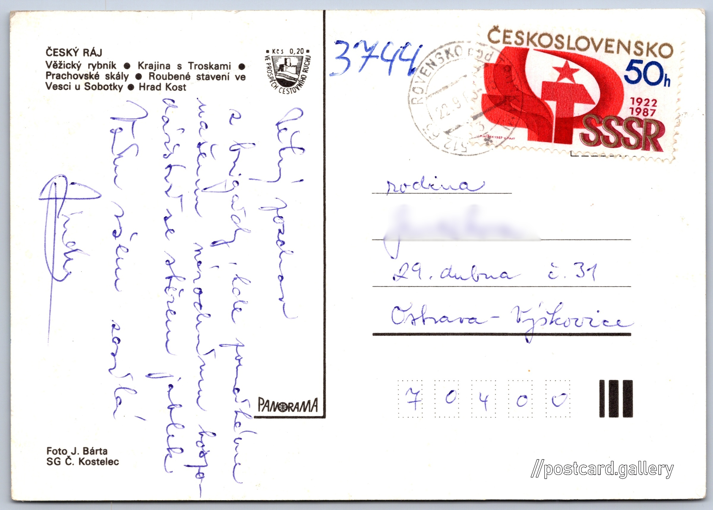 Pozdrav z Českého ráje Pokud chcete vidět pohlednice ve vyšším rozlišení nebo zobrazovat jejich zadní stranu, tak se prosím nejdříve přihlašte Přihlásit Zaregistrovat Pozdrav z Českého ráje ČESKÝ RÁJ- Věžický rybník- Krajina s Troskami- Prachovské skály- Roubené stavení ve Vesci u Sobotky- Hrad Kost Jazyk tištěného textu na pohlednici: čeština Krčkovice, Hrubá Skála, Semily ukázat na mapě Vydavatel: Panorama (Československo) Datum vydání není známo Pomozte nám odhadnout datum vzniku pohlednice Velikost (š x v) a tvar pohlednice: 148 x 104 mm (5.83" x 4.09"), obdélník Osoby spjaté s touto pohlednicí: Jan Bárta(Autor fotografie) Prošlá poštou Ceny: Příplatek na tur. ruch: 0,20 Kčs (CSK))Vyplacené známky: 0,50 Kčs (CSK) DiskuseVložit příspěvek Přidat novou složku ... Spravovat složky ...