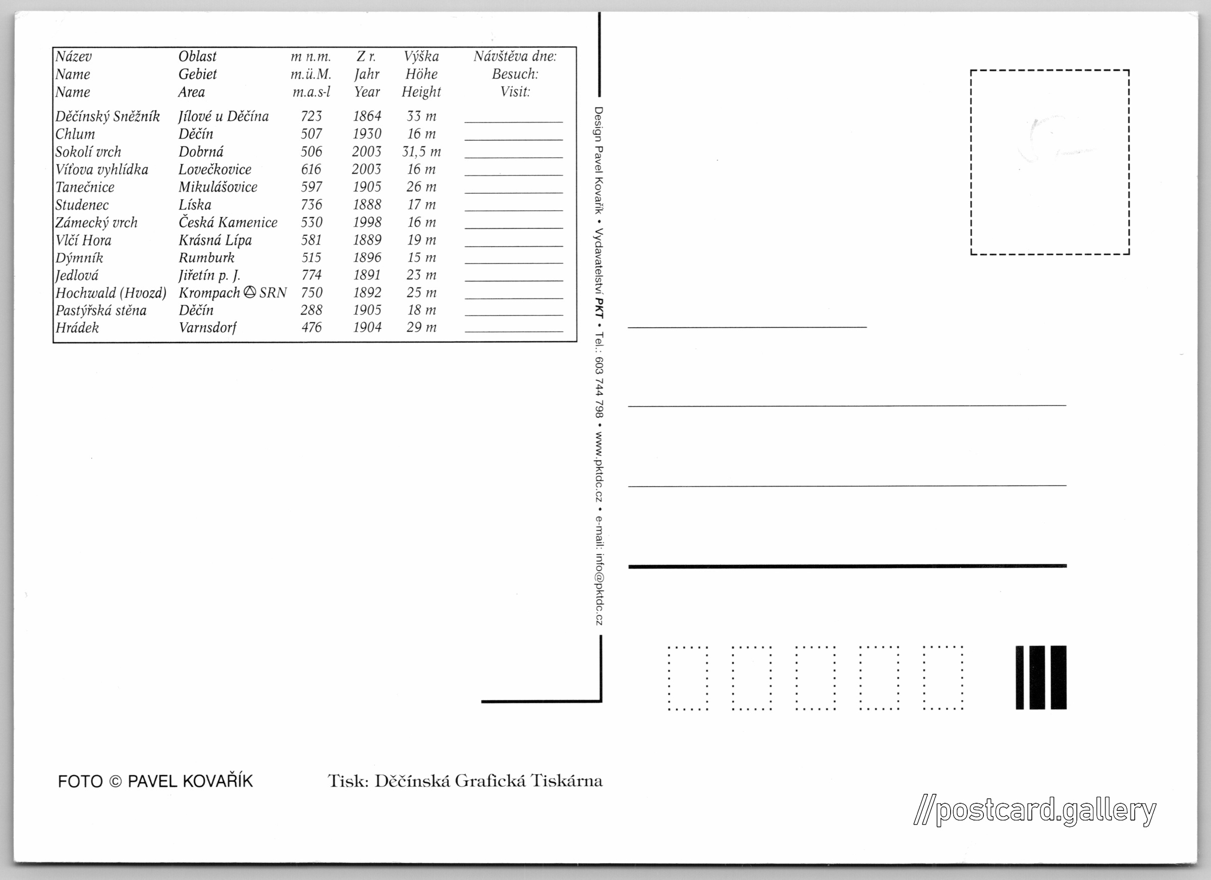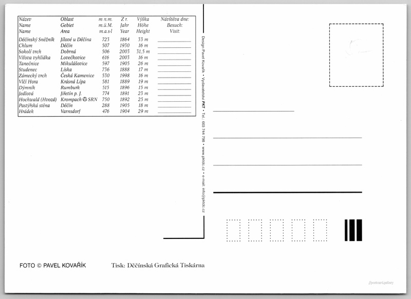 Pozdrav z Děčínska a okolí Pokud chcete vidět pohlednice ve vyšším rozlišení nebo zobrazovat jejich zadní stranu, tak se prosím nejdříve přihlašte Přihlásit Zaregistrovat Pozdrav z Děčínska a okolí Jazyk tištěného textu na pohlednici: čeština Rozhledna Děčínský Sněžník, Rozhledna, Sněžník 1, Jílové - Sněžník, Česko ukázat na mapě Vydavatel: Vydavatelství PKT (Česko) Datum vydání není známo Pomozte nám odhadnout datum vzniku pohlednice Velikost (š x v) a tvar pohlednice: 148 x 106 mm (5.83" x 4.17"), obdélník Osoby spjaté s touto pohlednicí: Pavel Kovařík(Autor fotografie) Čistá pohlednice (neprošlá poštou) DiskuseVložit příspěvek Přidat novou složku ... Spravovat složky ...