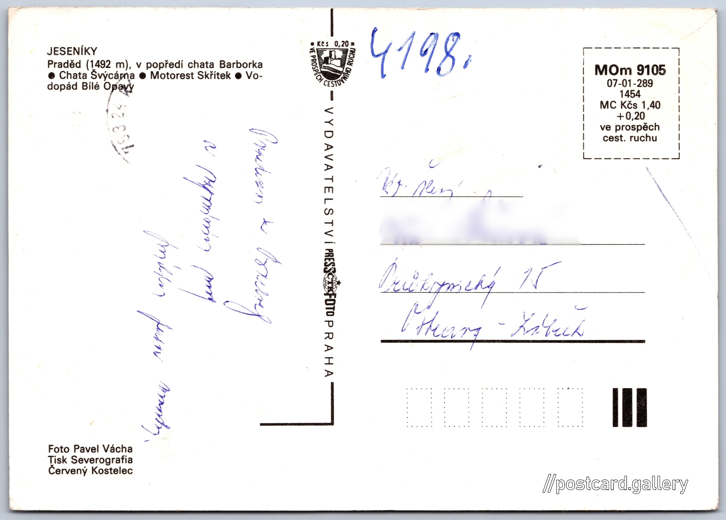 Pozdrav z Jeseníků Pokud chcete vidět pohlednice ve vyšším rozlišení nebo zobrazovat jejich zadní stranu, tak se prosím nejdříve přihlašte Přihlásit Zaregistrovat Pozdrav z Jeseníků JESENÍKY- Praděd (1492 m), v popředí chata Barborka- Chata Švýcárna- Motorest Skřítek- Vodopád Bílé Opavy Jazyk tištěného textu na pohlednici: čeština Praděd (1491 m), Hora, výškový bod, Malá Morávka, Česko ukázat na mapě Vydavatel: PressFoto Praha (Československo) Rok vydání pohlednice: 1982 Velikost (š x v) a tvar pohlednice: 148 x 104 mm (5.83" x 4.09"), obdélník Osoby spjaté s touto pohlednicí: Pavel Vácha(Autor fotografie) Prošlá poštou Ceny: Cena pohlednice: 1,40 Kčs (CSK) (+0,20 Kčs přípl. na tur. ruch) Kódy na pohlednici: MOm 9105 07-01-289 1454 DiskuseVložit příspěvek Přidat novou složku ... Spravovat složky ...