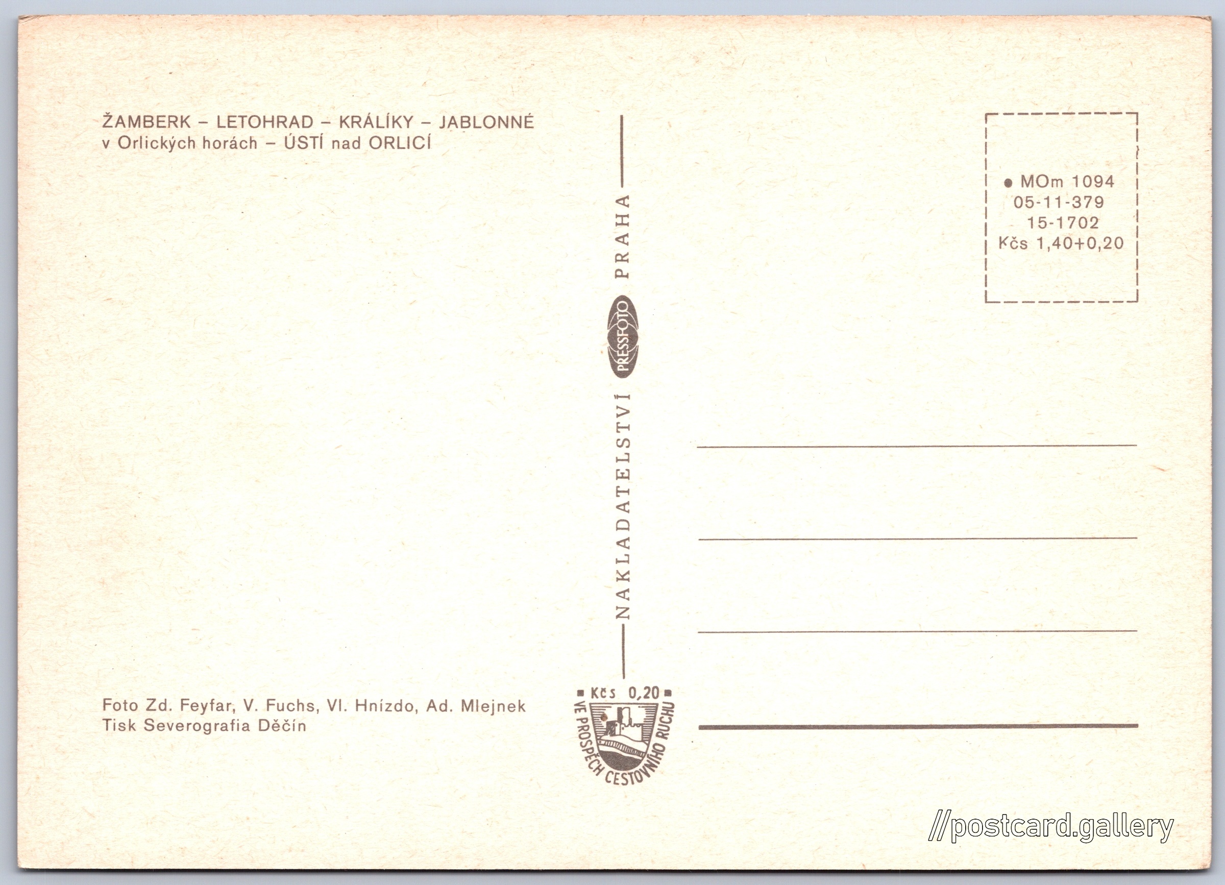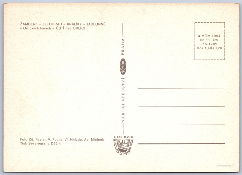 Pozdrav z Podorlicka Pokud chcete vidět pohlednice ve vyšším rozlišení nebo zobrazovat jejich zadní stranu, tak se prosím nejdříve přihlašte Přihlásit Zaregistrovat pozdrav z Podorlicka ŽAMBERK - LETOHRAD - KRÁLÍKY - JABLONNÉ v Orlických horách - ÚSTÍ nad ORLICÍ Jazyk tištěného textu na pohlednici: čeština Masarykovo náměstí, Žamberk, Ústí nad Orlicí ukázat na mapě V blízkém okolí místa zobrazeného na pohlednici lze najít 4 jiné pohlednice. Zobrazit blízké pohlednice Vydavatel: PressFoto Praha (Československo) Rok vydání pohlednice: 1973 Velikost (š x v) a tvar pohlednice: 148 x 105 mm (5.83" x 4.13"), obdélník Osoby spjaté s touto pohlednicí: Václav Fuchs(Autor fotografie) Zdenko Feyfar(Autor fotografie) Ad. Mlejnek(Autor fotografie) Vladimír Hnízdo(Autor fotografie) Čistá pohlednice (neprošlá poštou) Ceny: Cena pohlednice: 1,40 Kčs (CSK) (+0,20 Kčs přípl. na tur. ruch) Kódy na pohlednici: •MOm 1094 05-11-379 15-1702 DiskuseVložit příspěvek Přidat novou složku ... Spravovat složky ...